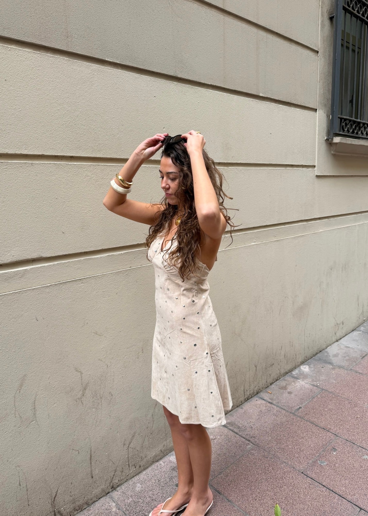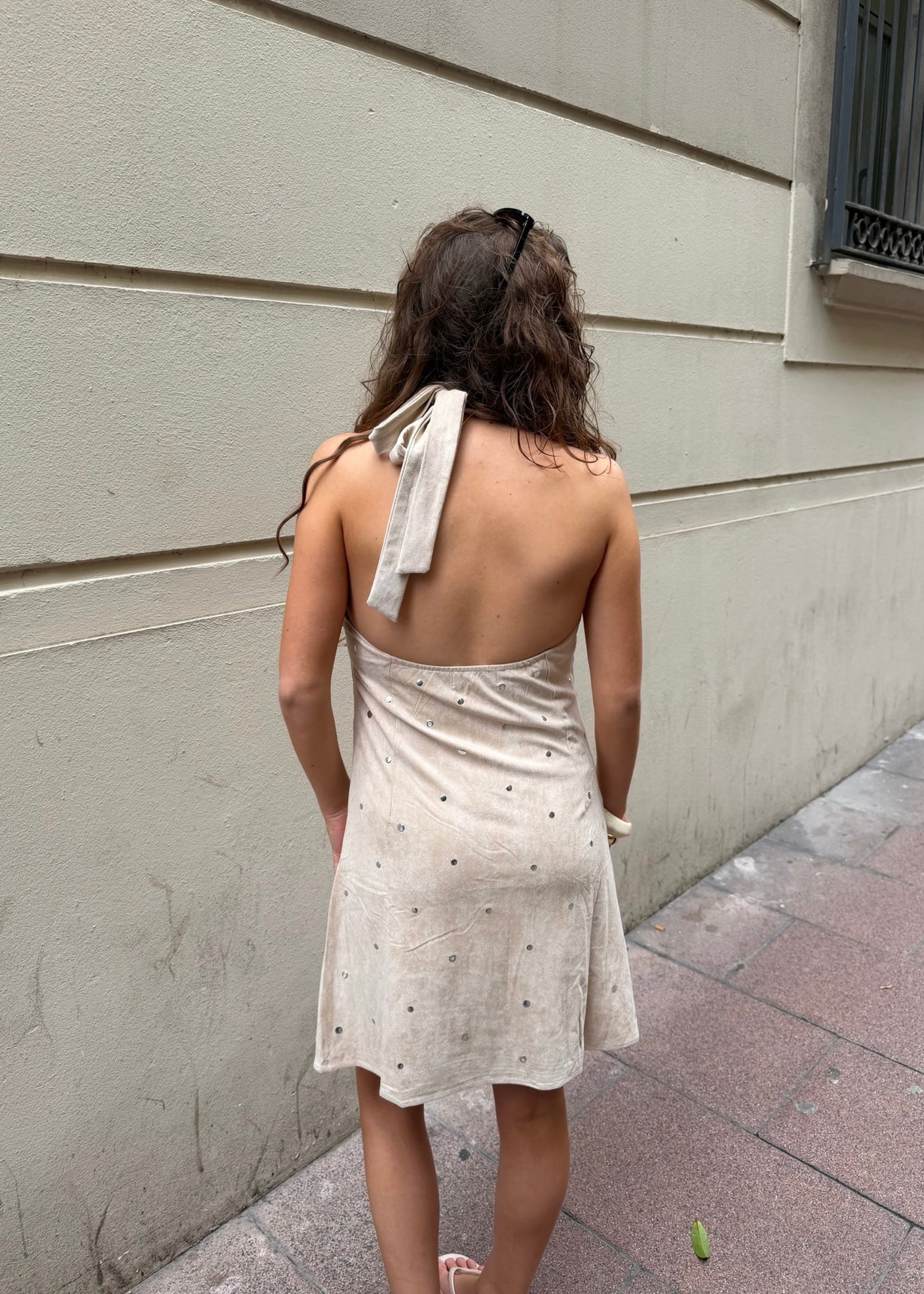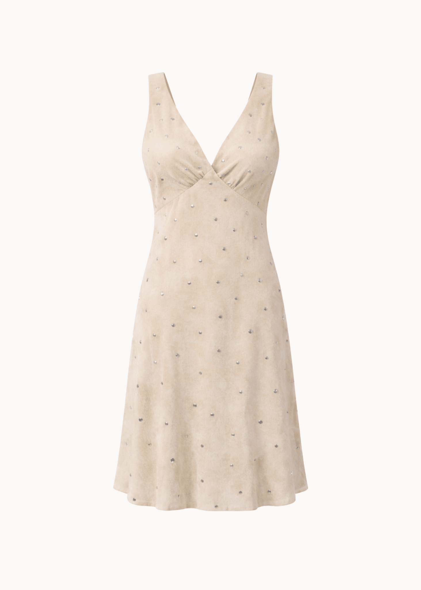 Aurora Stud Kjolen er en elegant og tidløs kjole med et feminint snit og eksklusive detaljer. Kjolen har brede stropper, der går op over skuldrene, og en flatterende V-udskæring med let rynkeeffekt ved barmen. Det bløde, let ruskindsinspirerede materiale er dekoreret med små, diskrete nitter, som giver et sofistikeret og eksklusivt look🤎