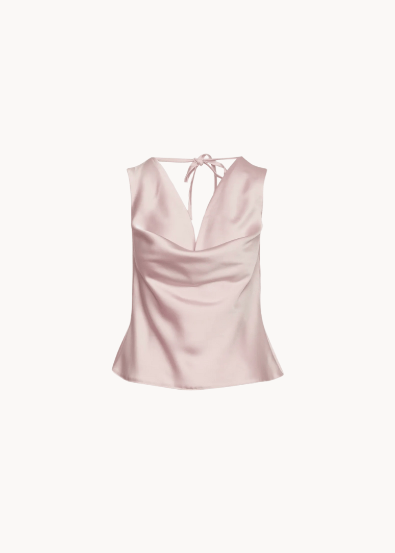 Vores Cleo-serie er fremstillet i det fineste satinlignende materiale, der giver et elegant udtryk. Toppen har en fin vandfaldsudskæring, der skaber et smukt draperet look. Denne drapering gentager sig på ryggen, hvilket giver toppen en flot, åben ryg, som bindes med et bindebånd✨