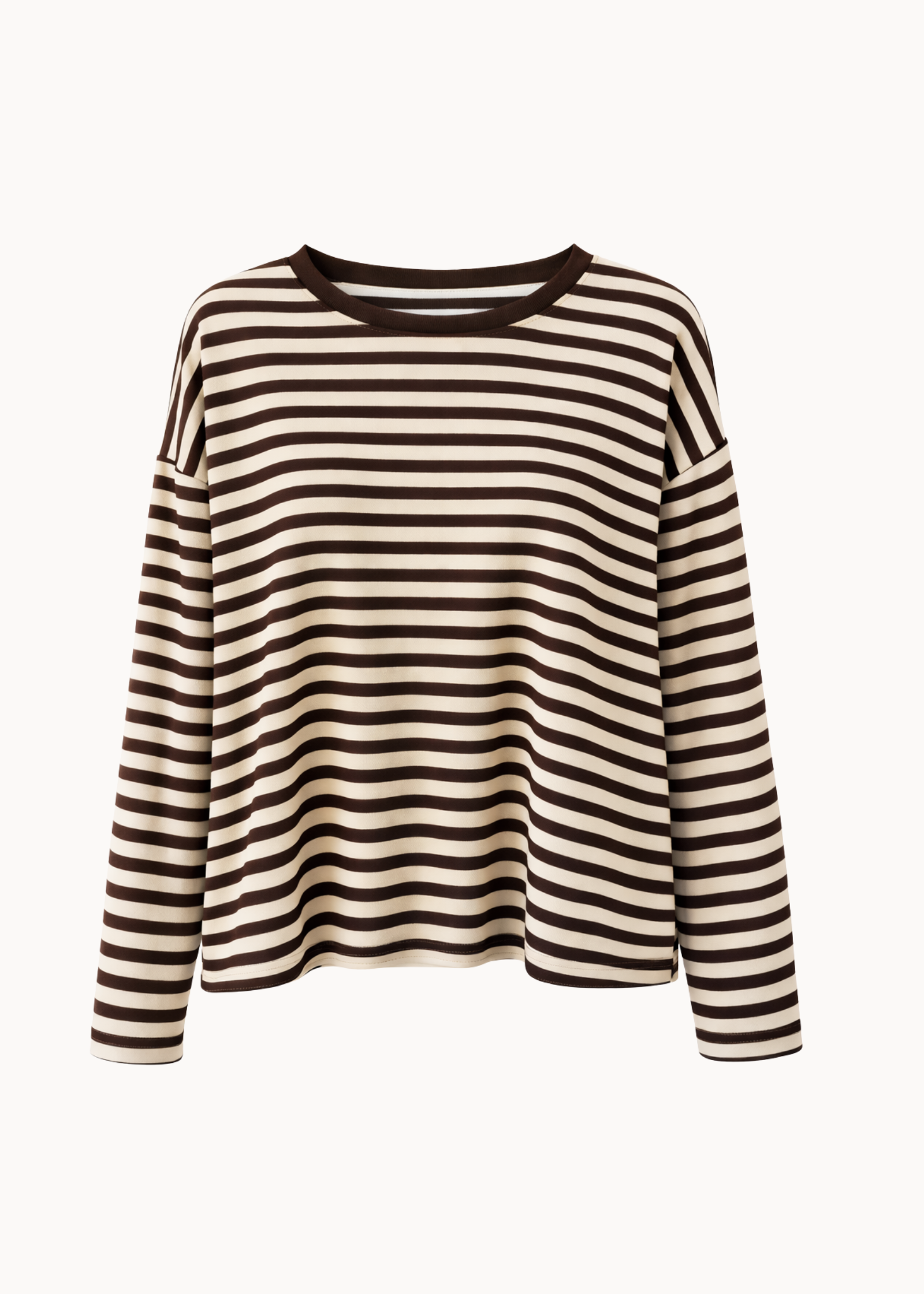 Lykke Stribet Bluse er en tidløs og afslappet bluse med klassiske, mørkebrune striber på en lys bund. Den bløde kvalitet og løse pasform giver et komfortabelt udtryk, mens den enkle, runde halsudskæring gør blusen nem at style til både hverdag og mere afslappede anledninger. En alsidig favorit, der fungerer perfekt sammen med jeans, bukser eller nederdel🤍