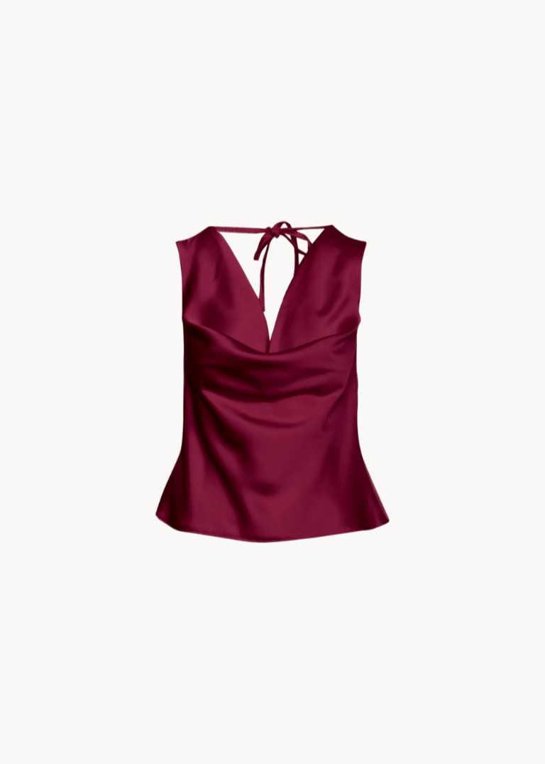 Vores Cleo-serie er fremstillet i det fineste satinlignende materiale, der giver et elegant udtryk. Toppen har en fin vandfaldsudskæring, der skaber et smukt draperet look. Denne drapering gentager sig på ryggen, hvilket giver toppen en flot, åben ryg, som bindes med et bindebånd✨