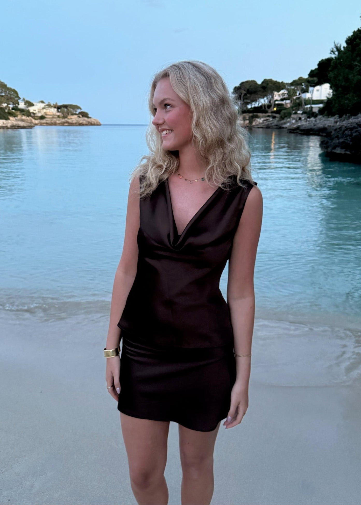 Køb vores Cleo Draperet Top og Cleo Mini Nederdel som et sæt og spar penge. Vores Cleo-serie er fremstillet i det fineste satinlignende materiale. Toppen har en fin vandfaldsudskæring, der skaber et smukt draperet look. Mini Nederdelen er en kort nederdel med elastik i taljen✨