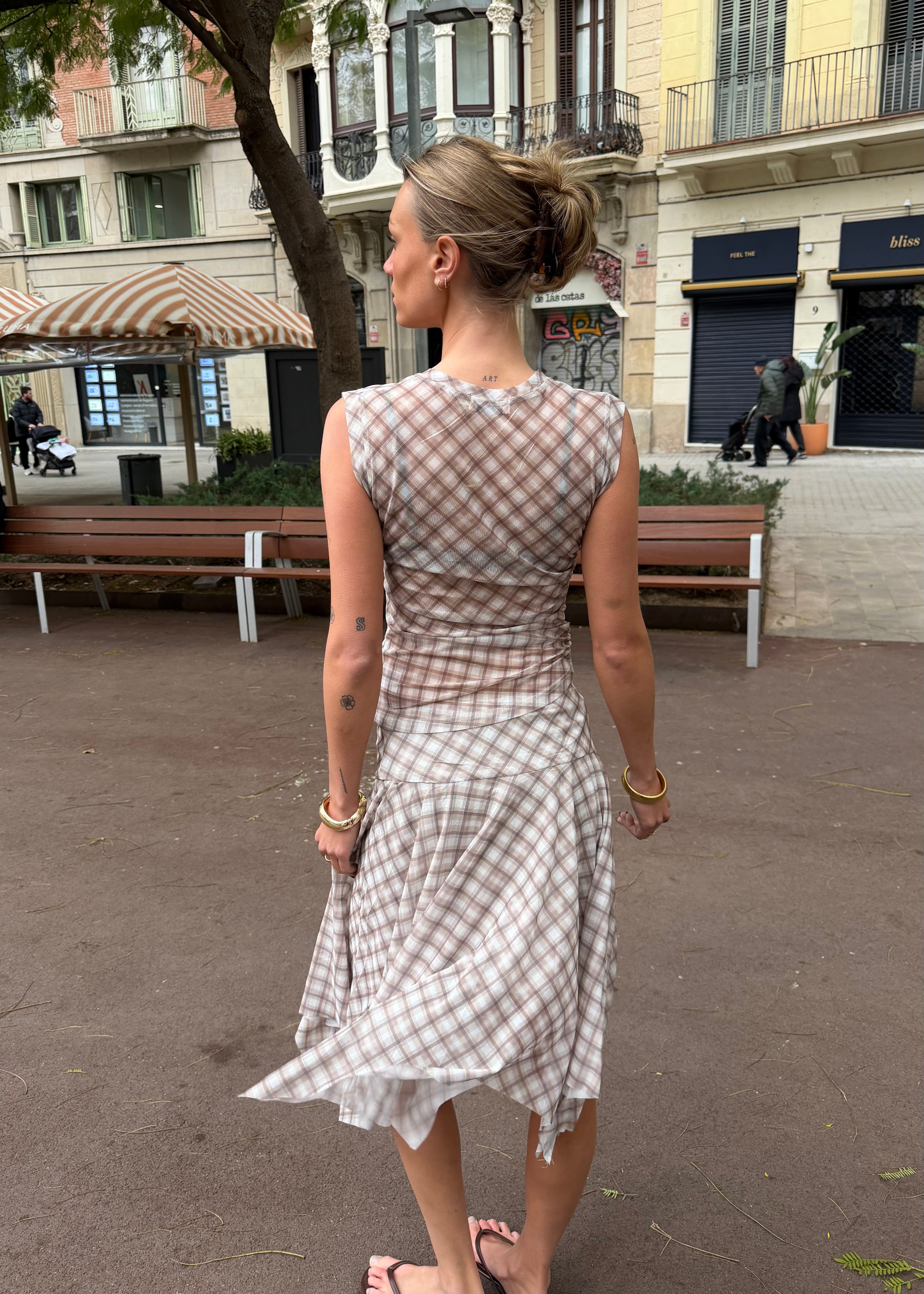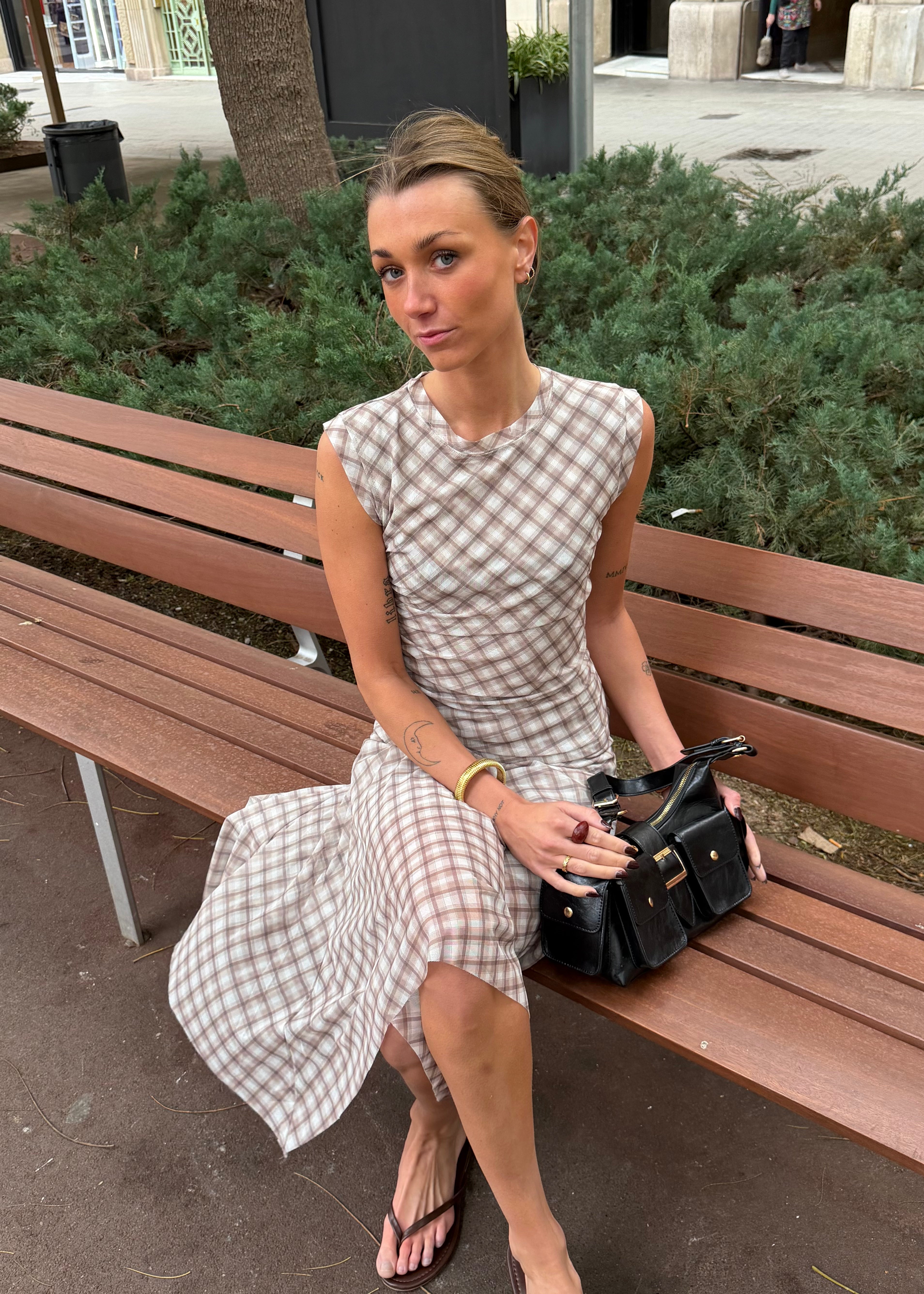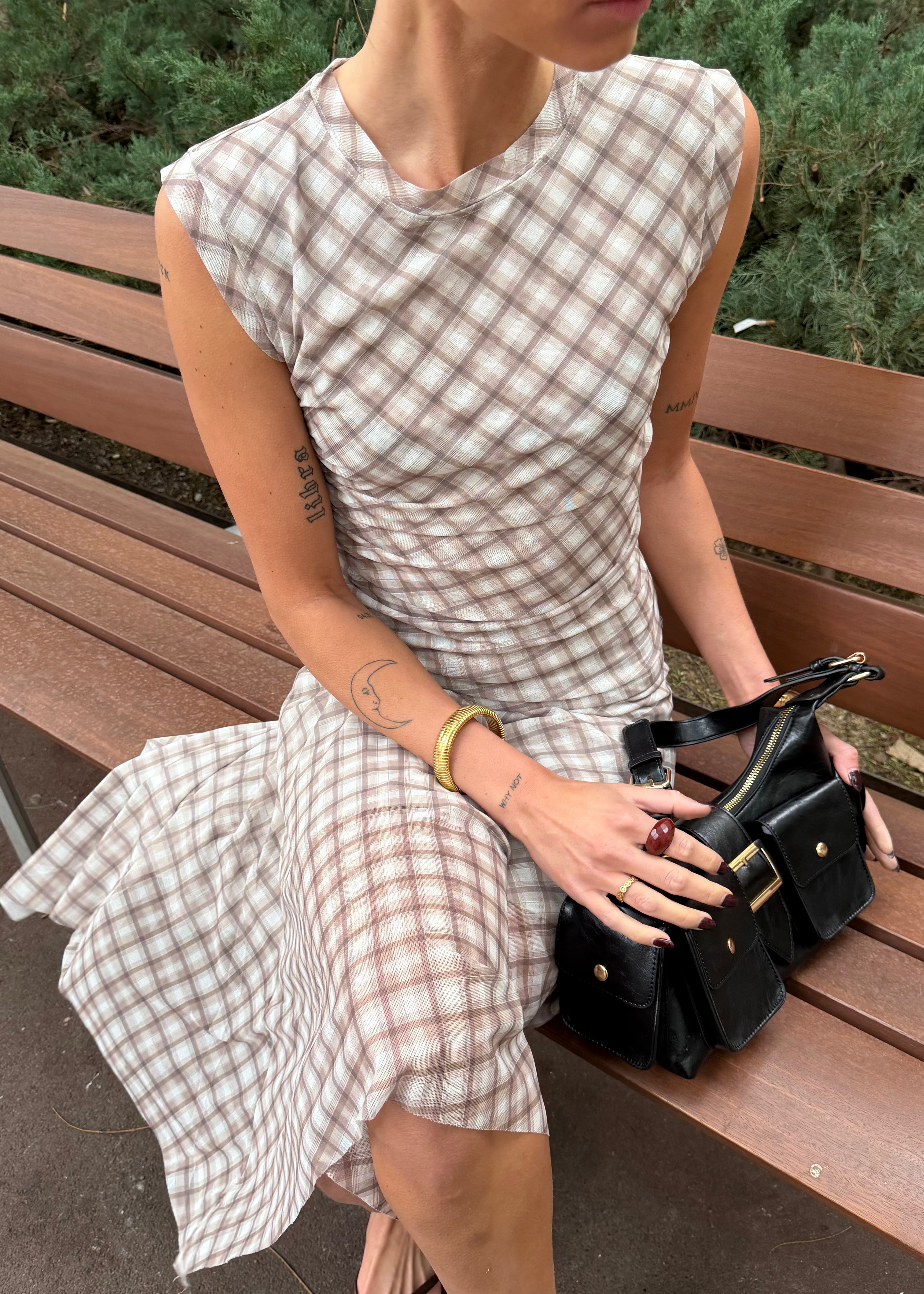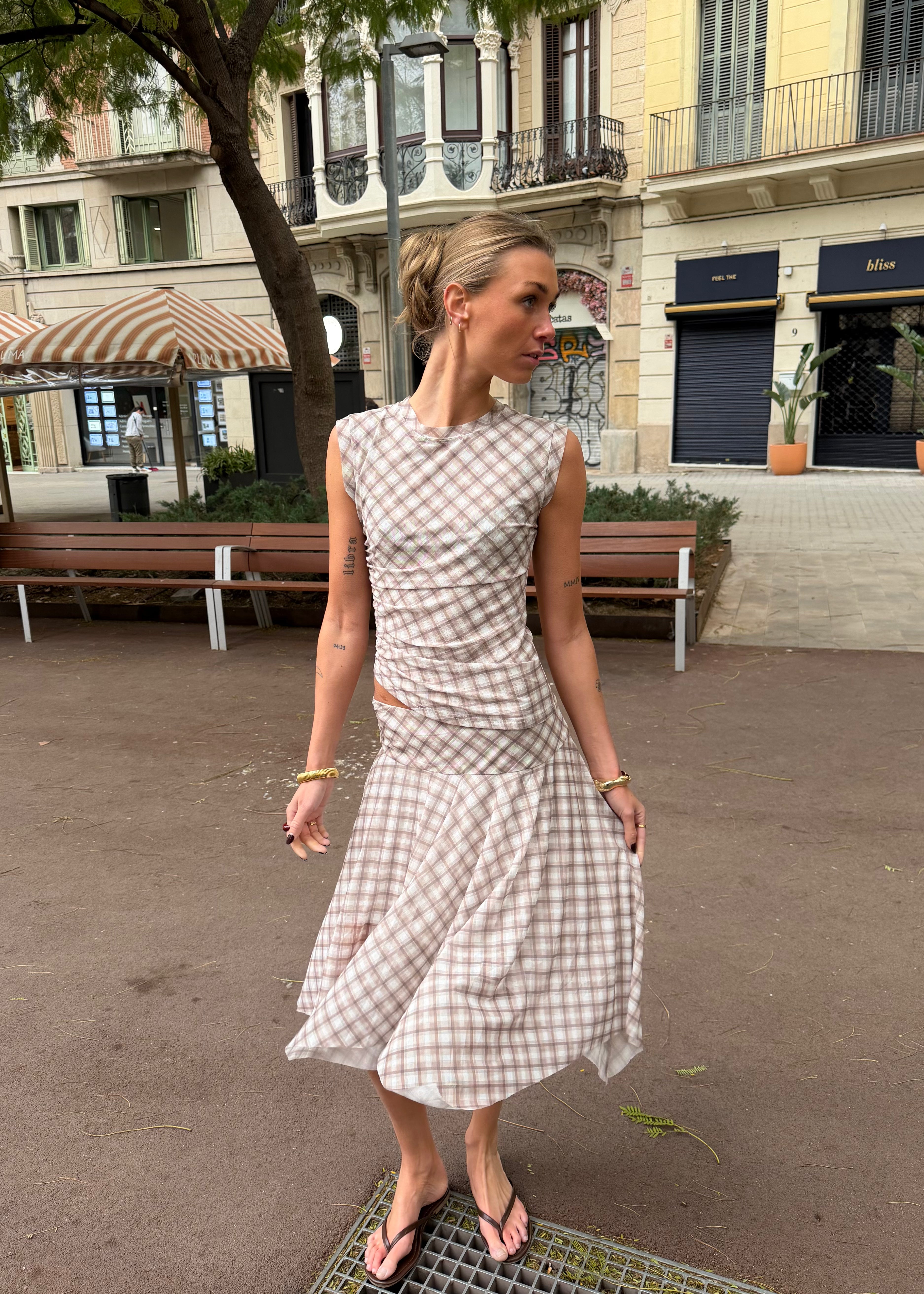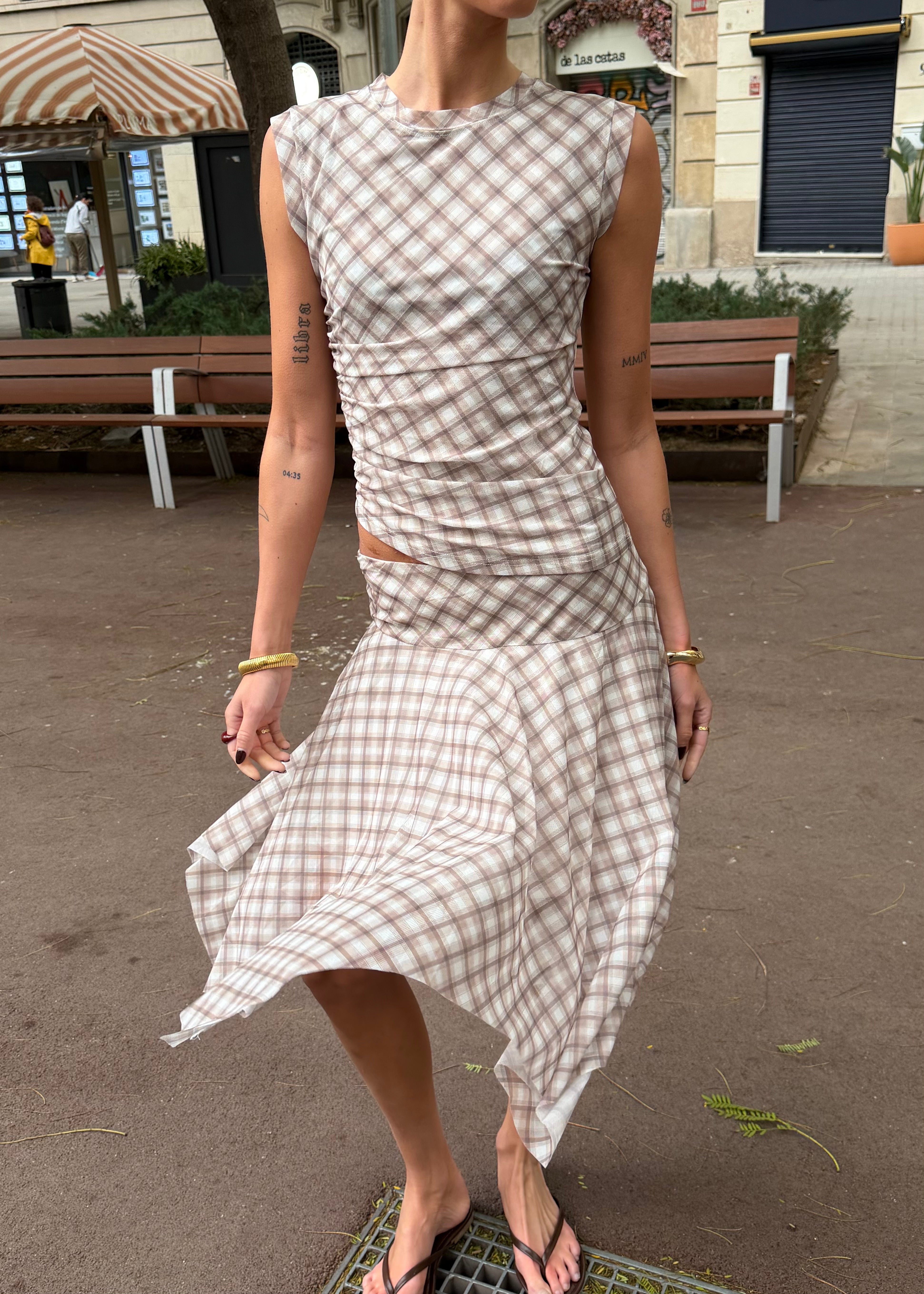 Vores Malukka Ternet Sæt består af den elegante Malukka Ternet Top og den matchende Malukka Ternet Nederdel. Sættet er designet i et blødt og strækbart materiale med et let mesh-look, som smyger sig flot om kroppen og skaber en smuk, let draperet effekt. Toppen har korte ærmer, mens nederdelen er i en elegant midi-længde, der giver et feminint og stilrent udtryk.