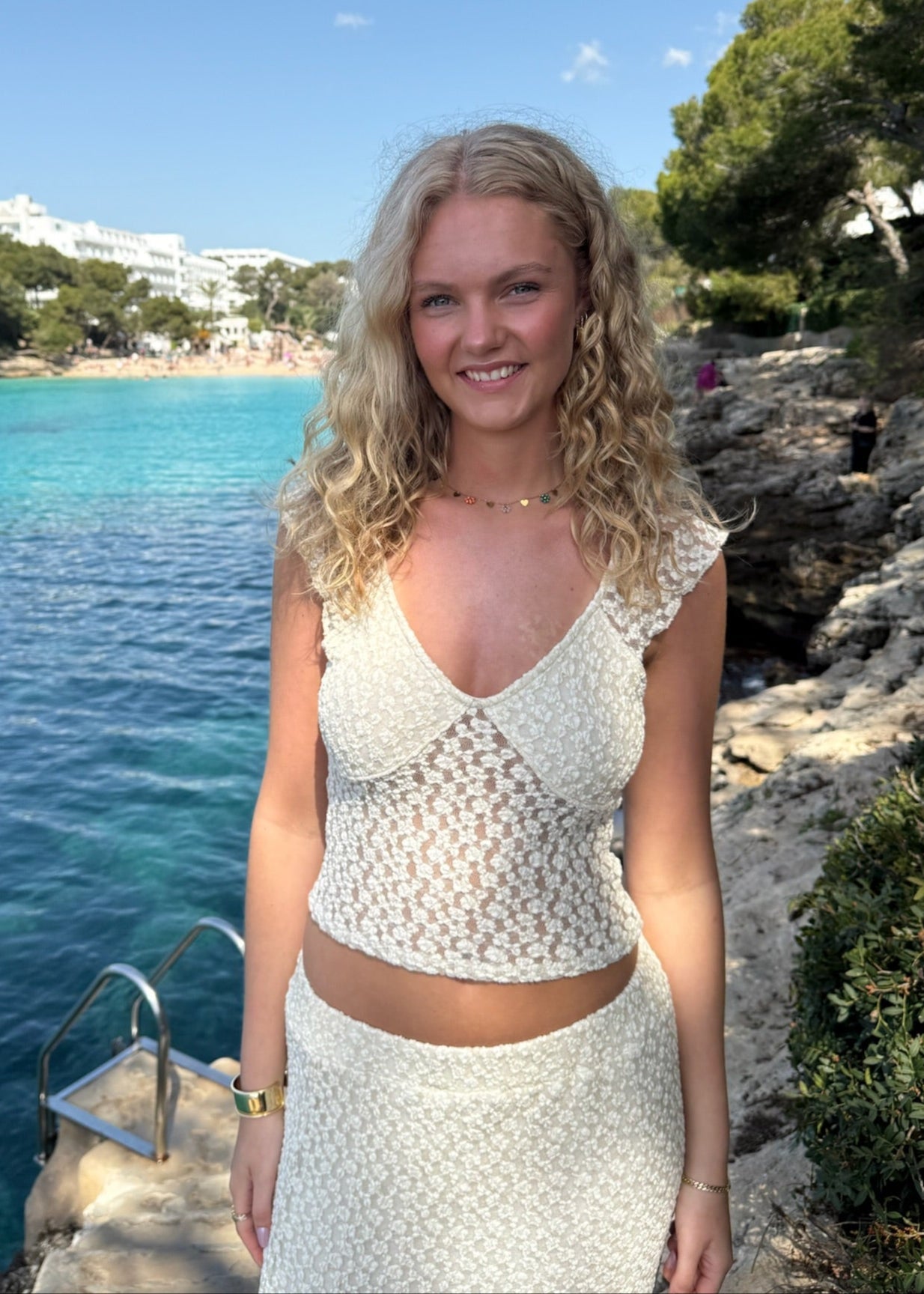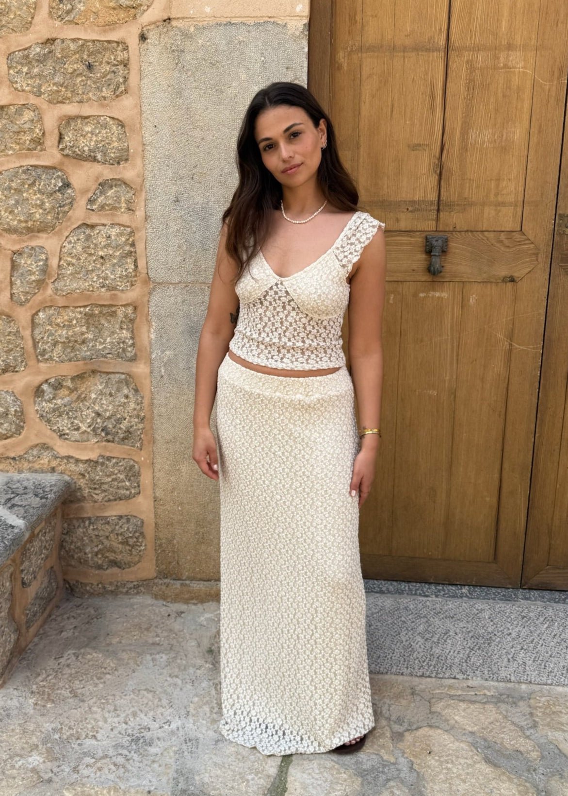 Vores smukke Norma Blonde sæt fås i Maxi Nederdel og Blonde T-shirt. Nederdelen er en smuk maxi nederdel med et flowy, lige fit, der falder utroligt elegant. Den har en blød, tynd underkjole, der forhindrer gennemsigtighed. Med elastikbånd i taljen kan nederdelen bæres både lavtaljet og højtaljet, alt efter ønsket look. Norma Blonde Toppen er lavet i blødt blondemateriale med et tyndt lag stof under brystet for dækning. Toppen har en smuk dyb udskæring foran og en klassisk firkantet udskæring bagpå. Den er feminin og kan blandt andet styles med vores matchende Norma Blonde Nederdel🤍