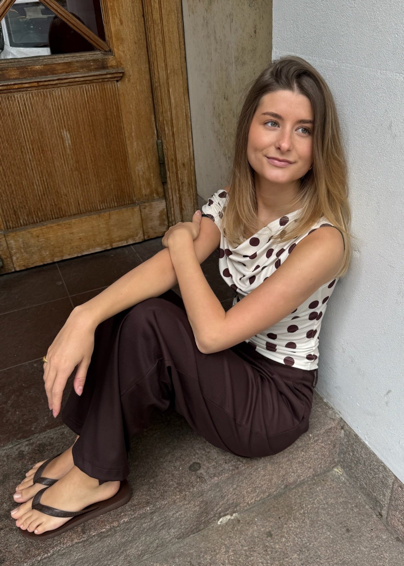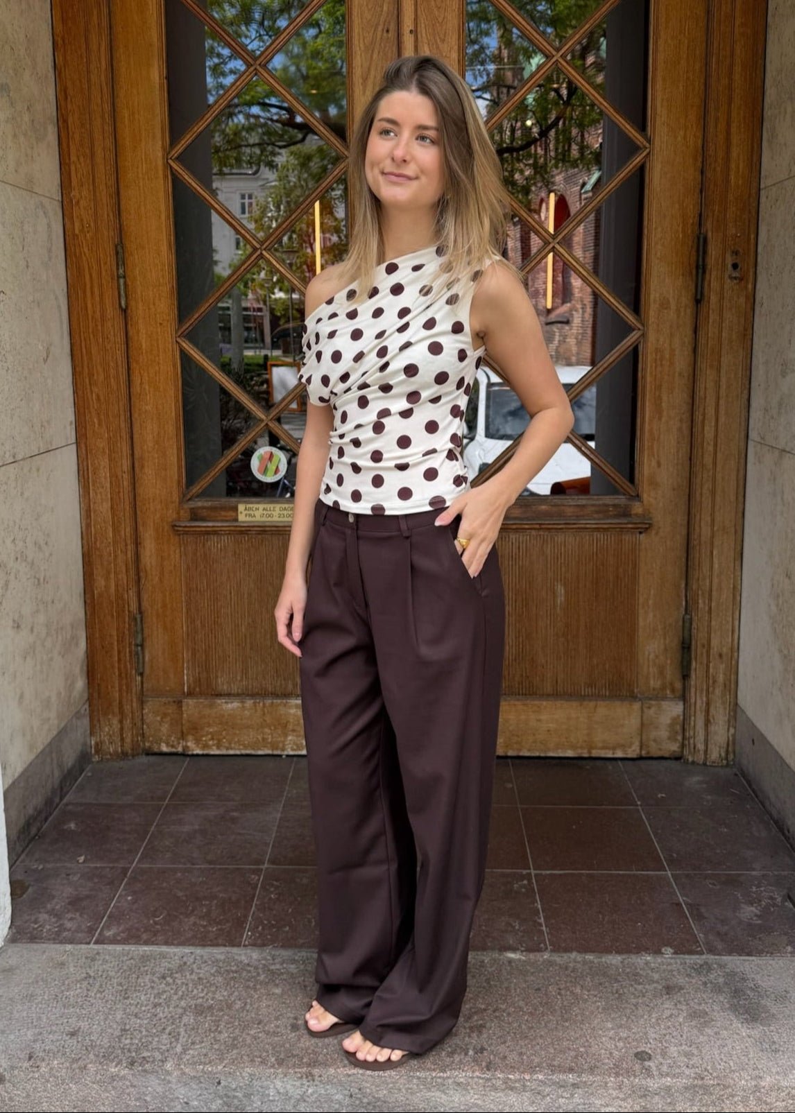 Vores Lola Top med Polkaprikker har et draperet, tætsiddende fit med en asymmetrisk skulder. Toppen passer perfekt til vores populære Sira Habitbukser i chokoladebrun. Bukserne har lange ben, et løst, lige fit, praktiske lommer og lukkes med knap og lynlås foran🤎