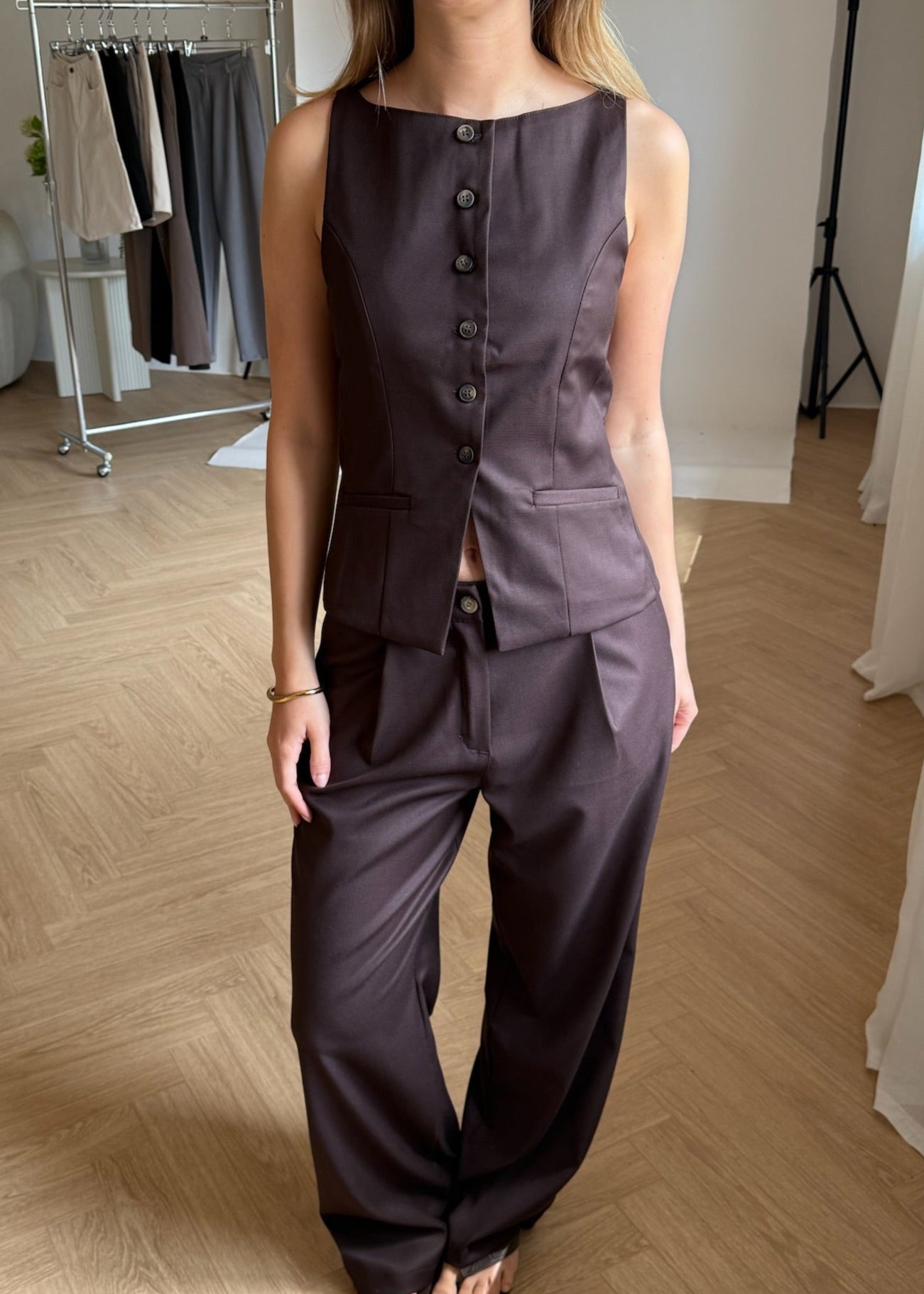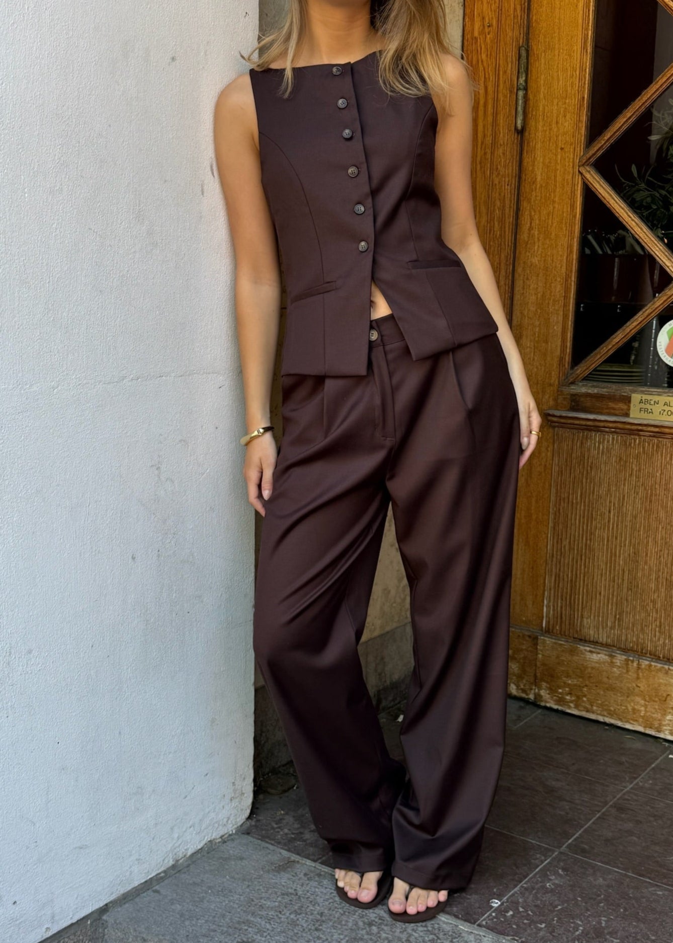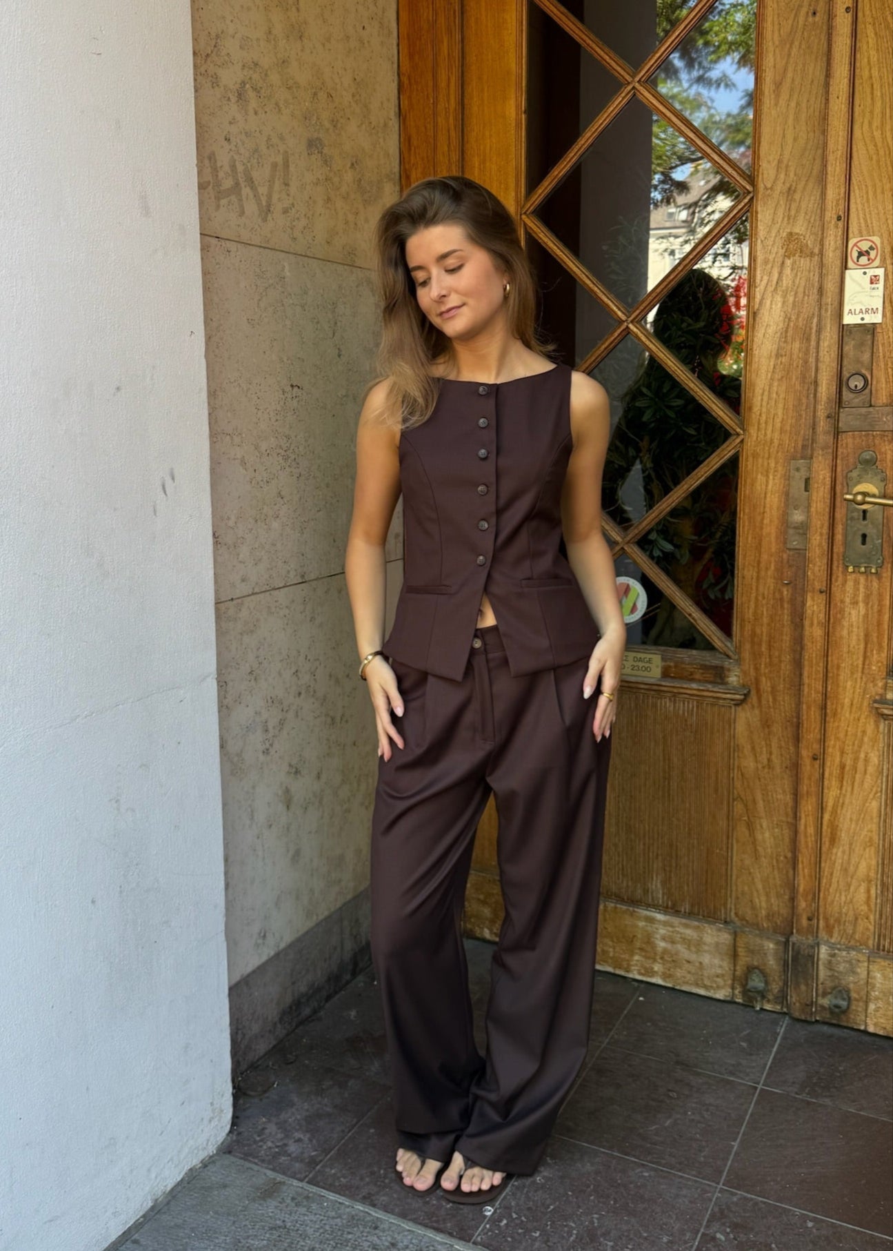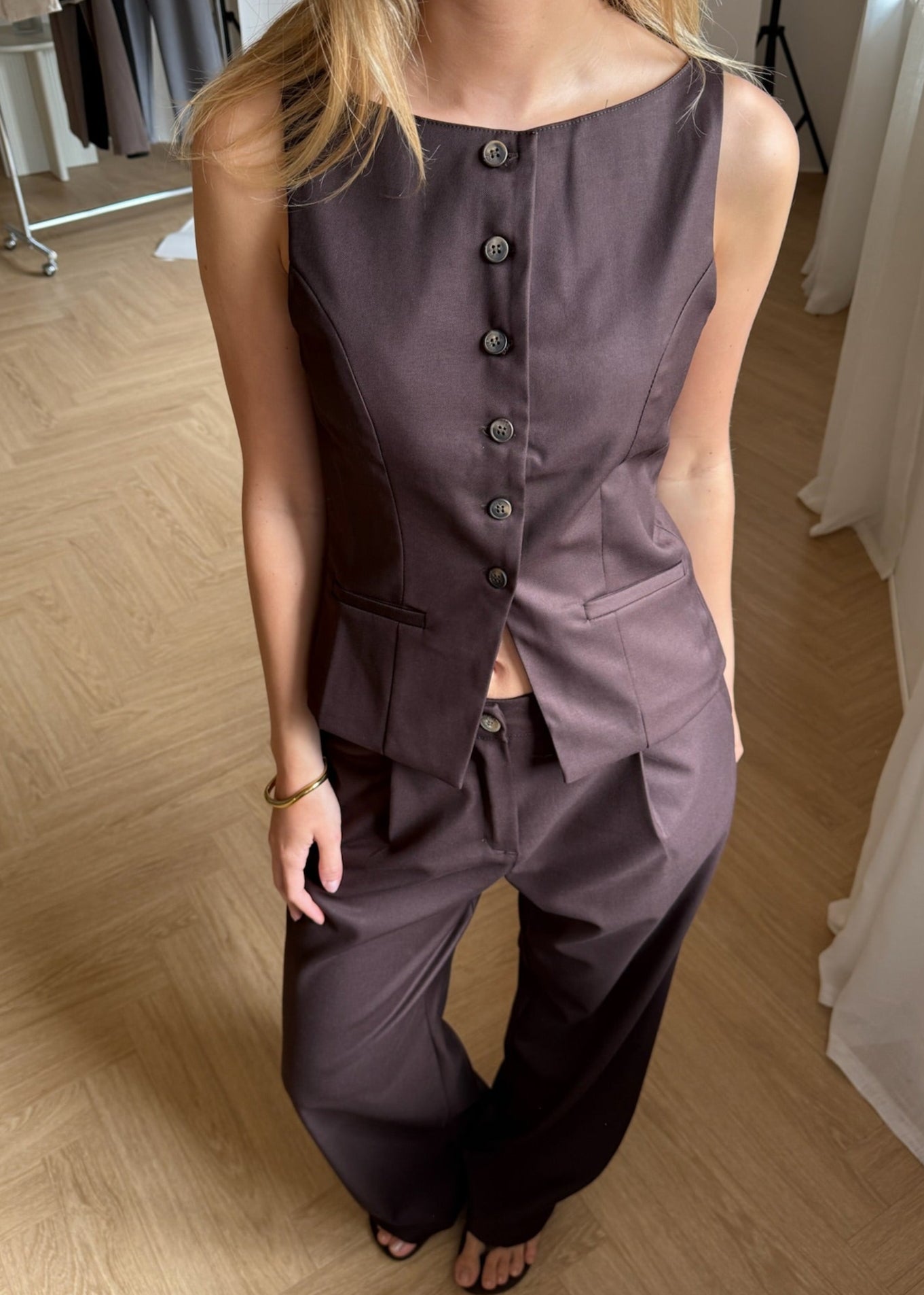 Vores smukke Sira sæt fås med Habitbukser og matchende vest. Bukserne har lange ben og et løst, lige fit. De har lommer og lukkes med knap og lynlås foran. Habitvesten har en bred, rund halsudskæring, klassisk knaplukning foran og to fine snydelommer🌟