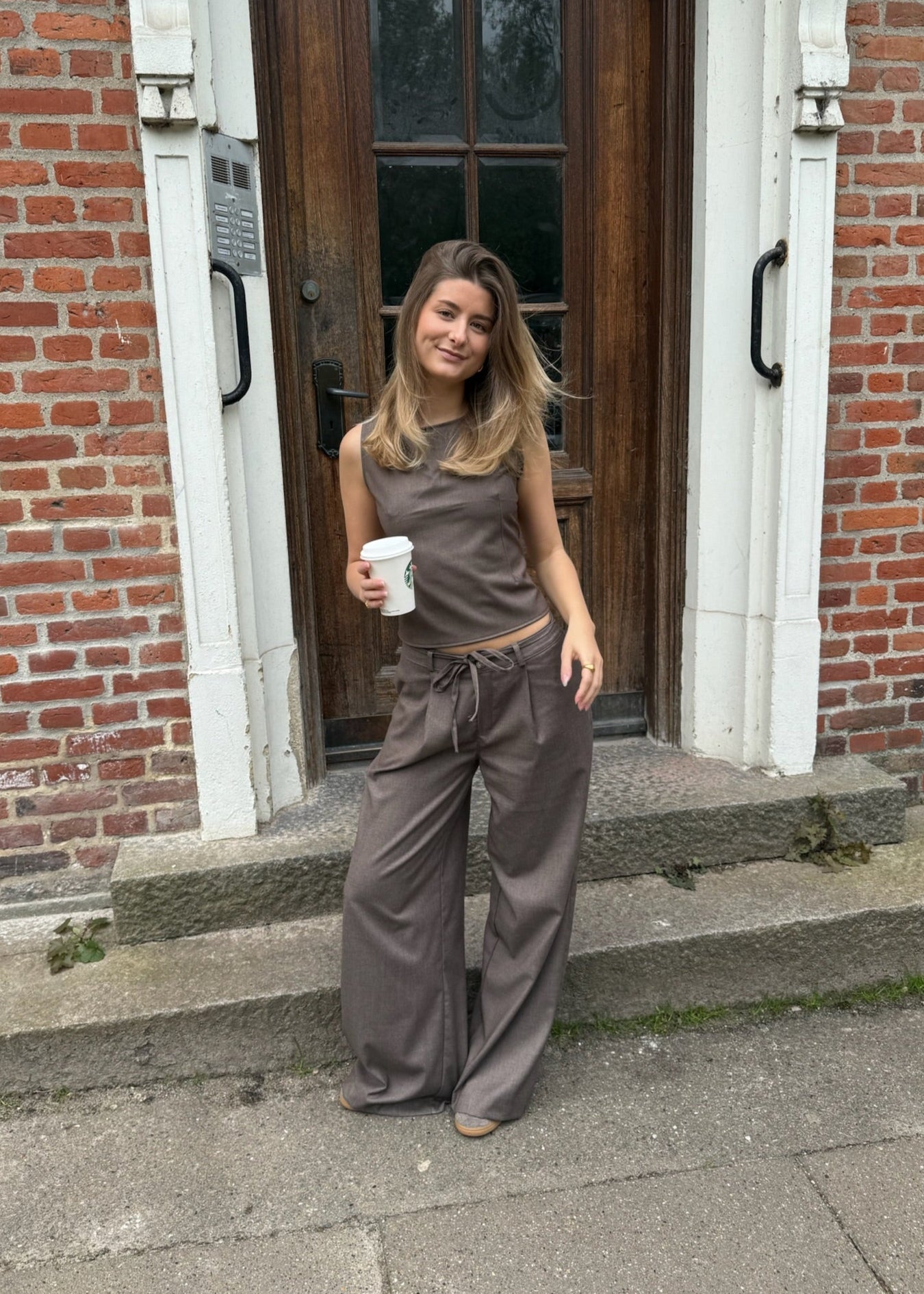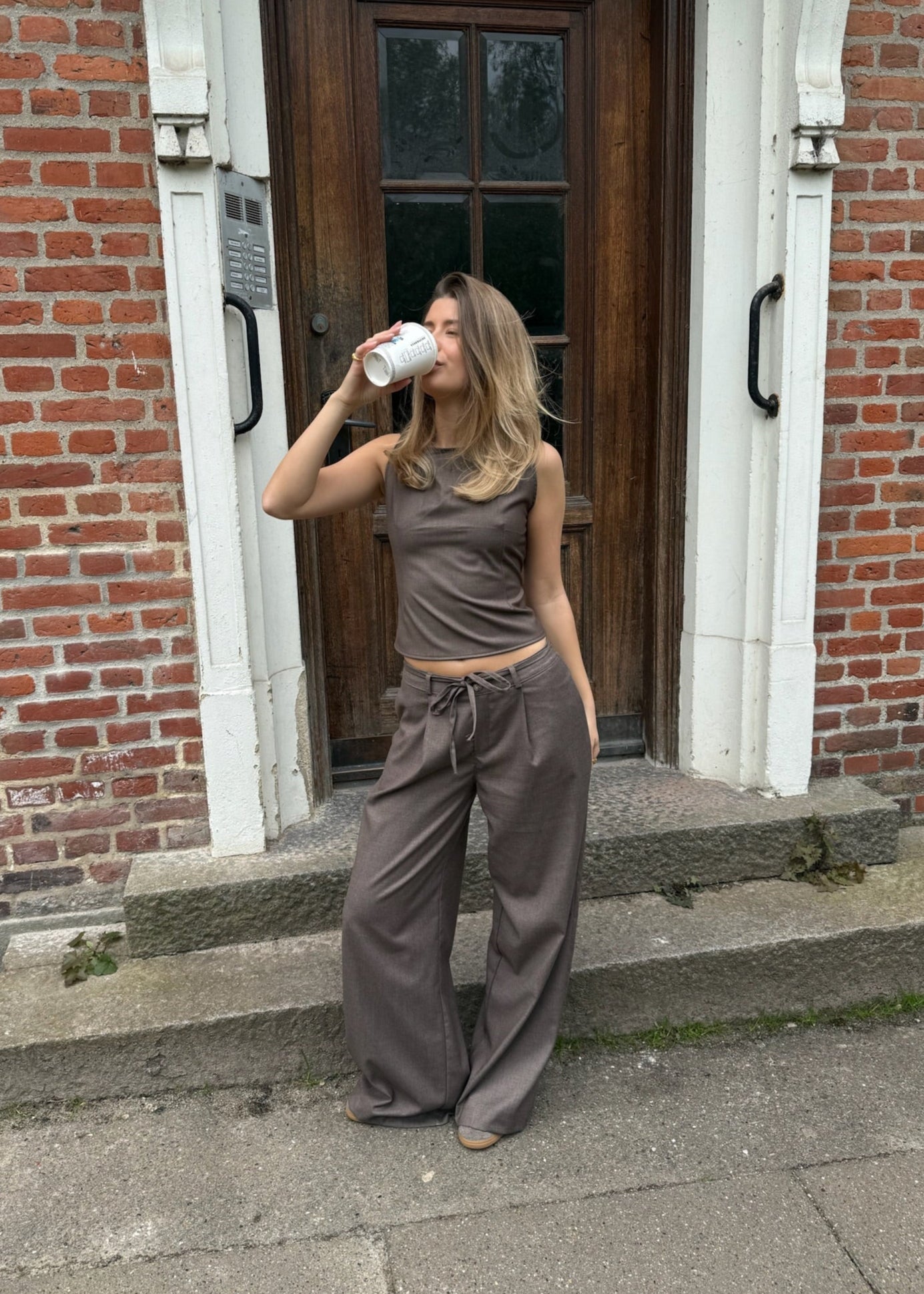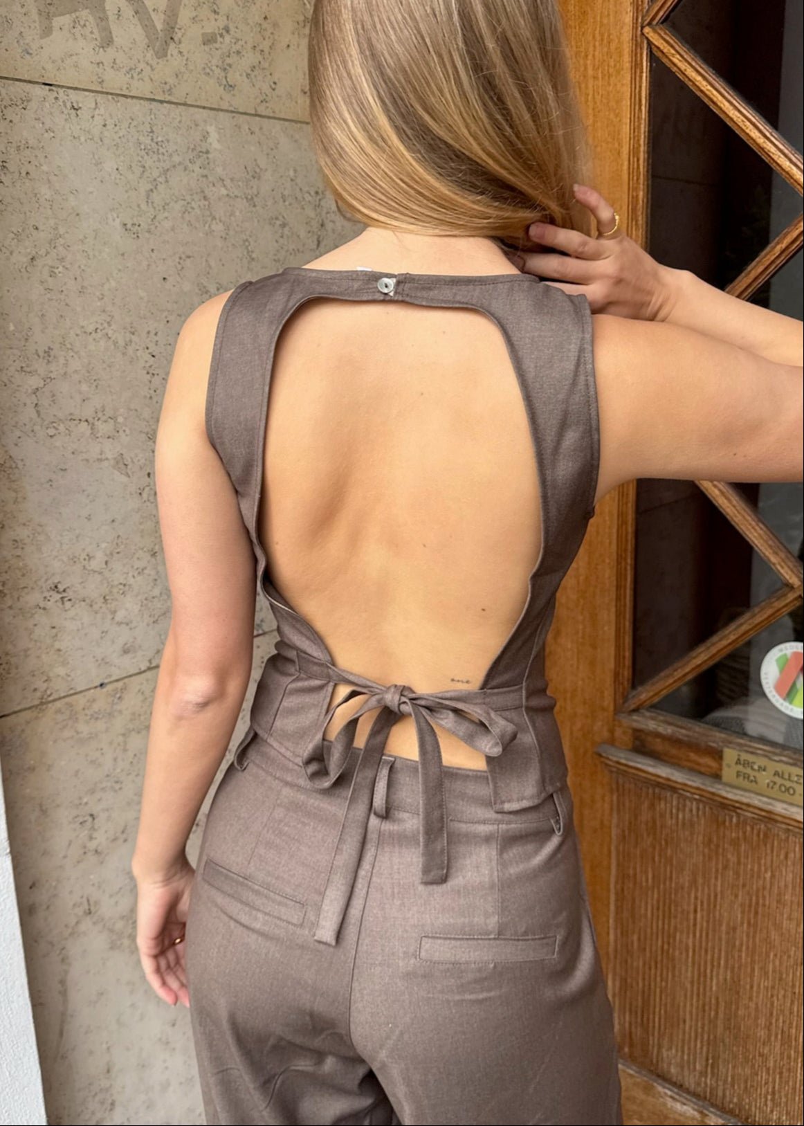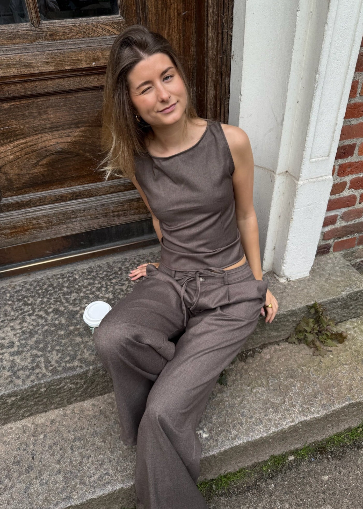 Det perfekte sæt! Vores vide Habit-bukser har skrålommer foran, bæltestropper og et aftageligt bindebånd. Bukserne har brede ben, en god længde og to falske baglommer. De matcher perfekt med vores populære Sira Top, som har en smuk, åben ryg og bindes elegant i taljen med et tyndt bindebånd🌟