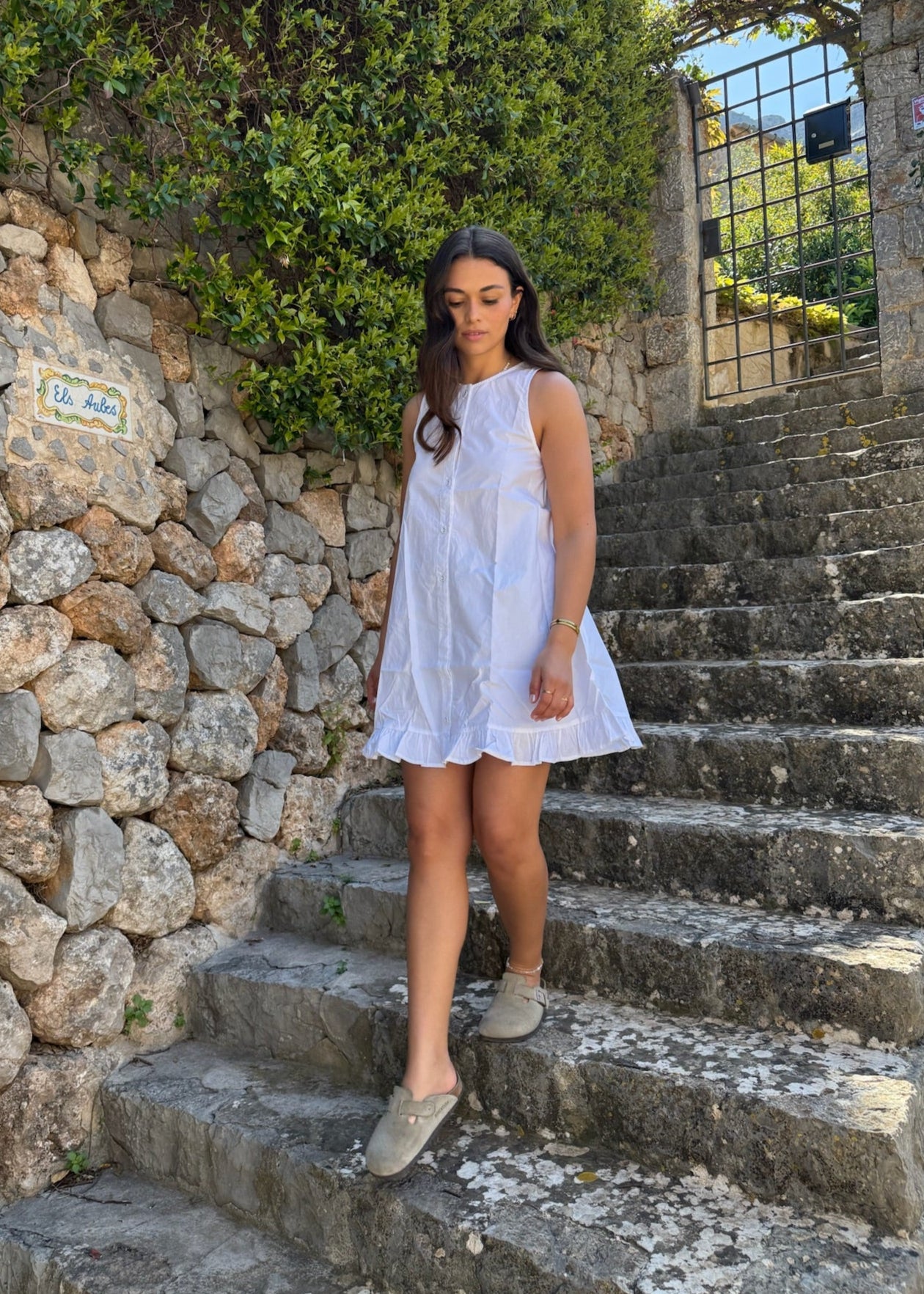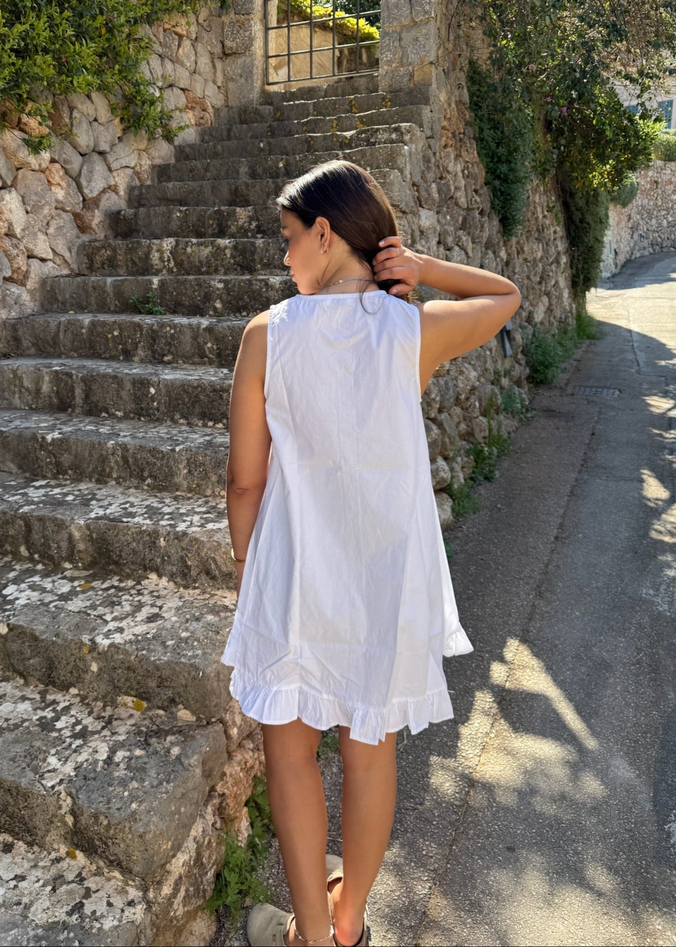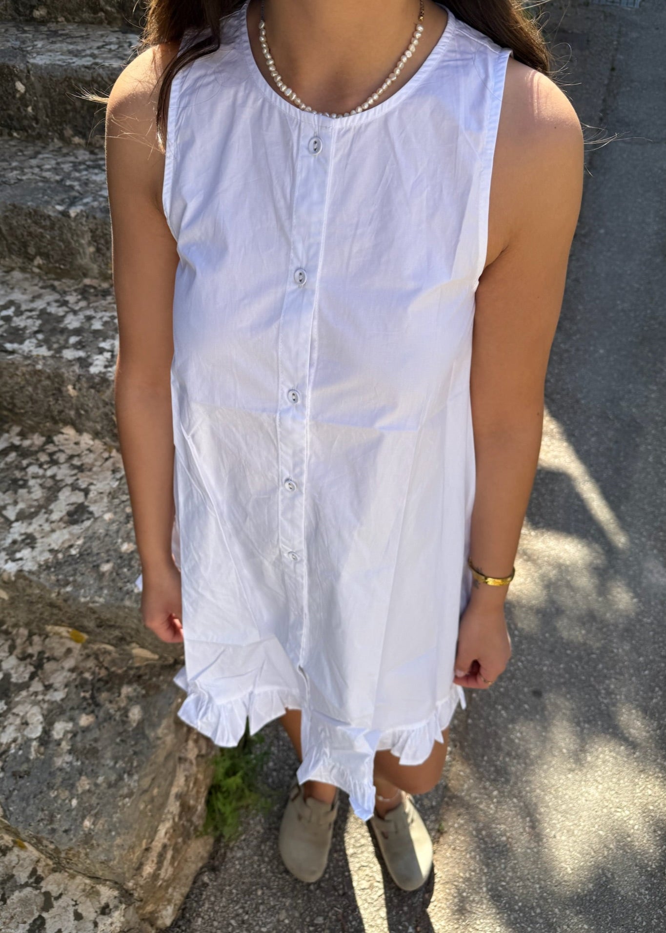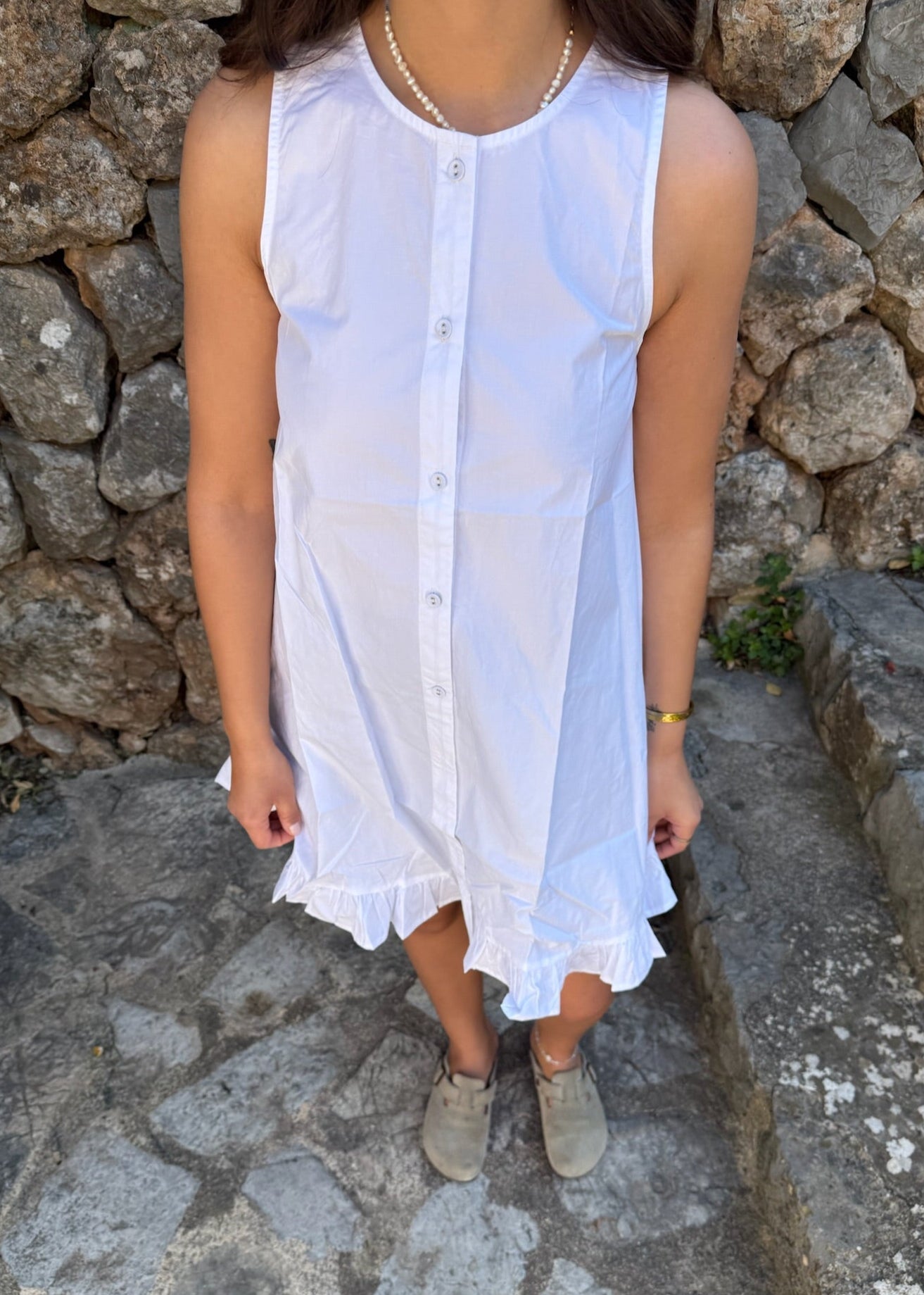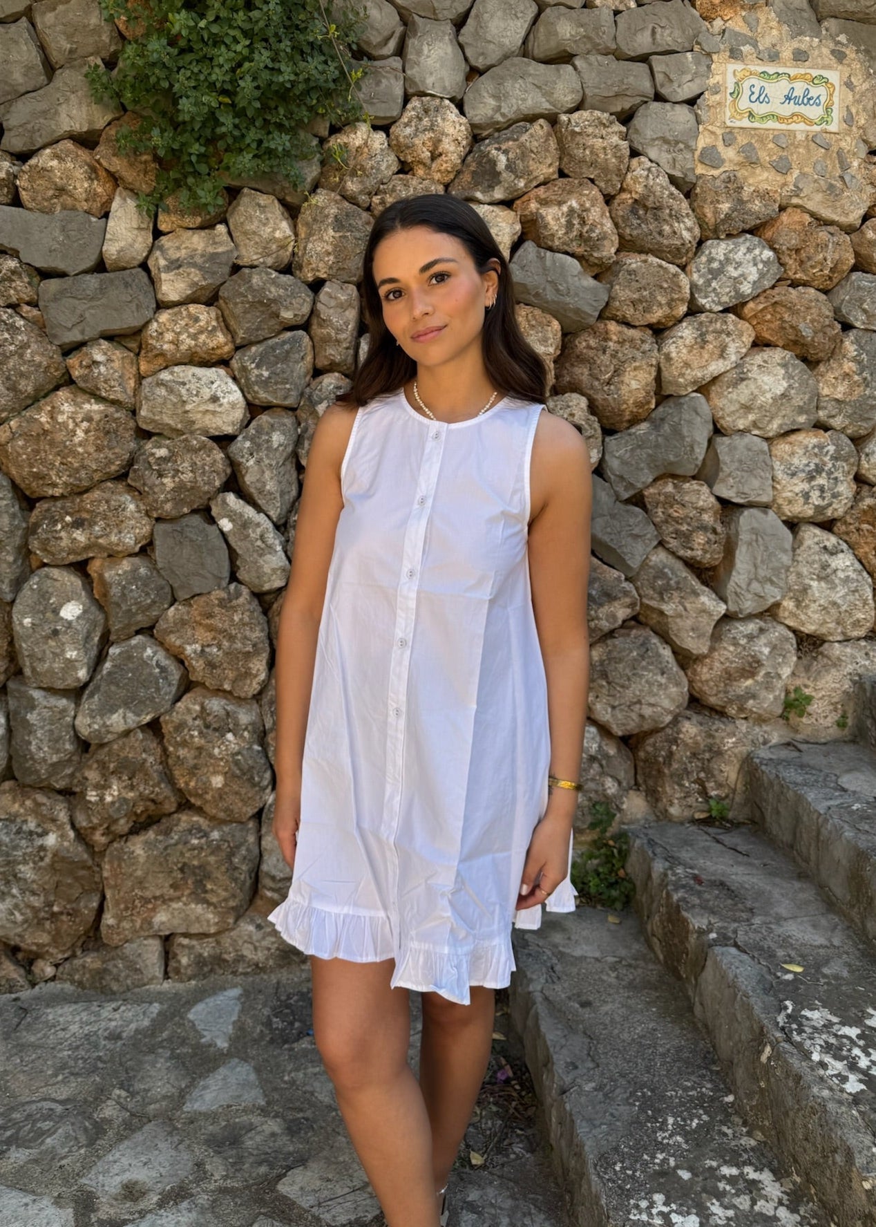 Vores Alina Mini Kjole er lavet i 100% bomuld. Det er en kort, klassisk og enkel kjole med et tidløst design. Kjolen er ærmeløs og har knapper ned langs midten, samt en lille flæsekant nederst for et sødt og feminint touch🌸