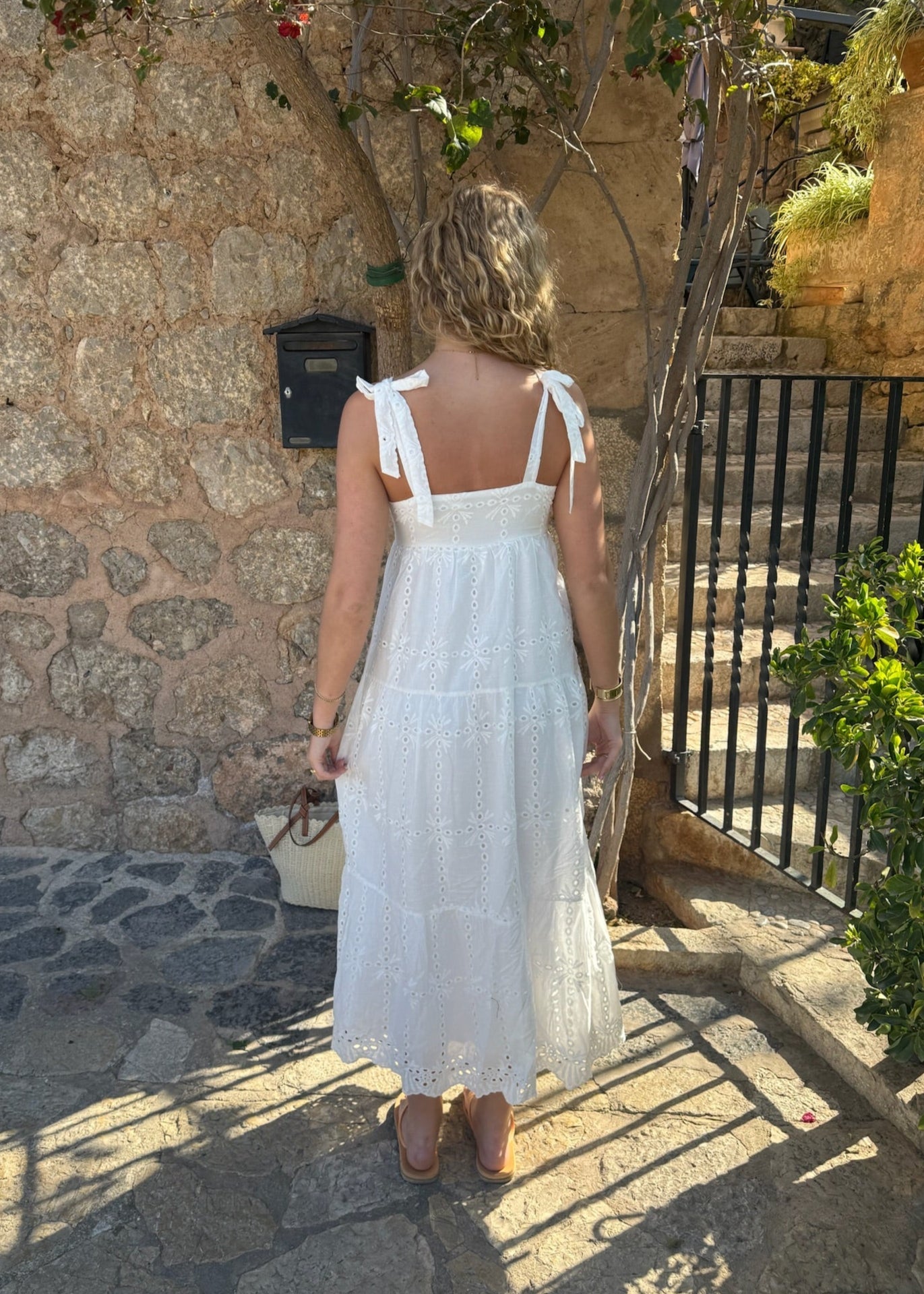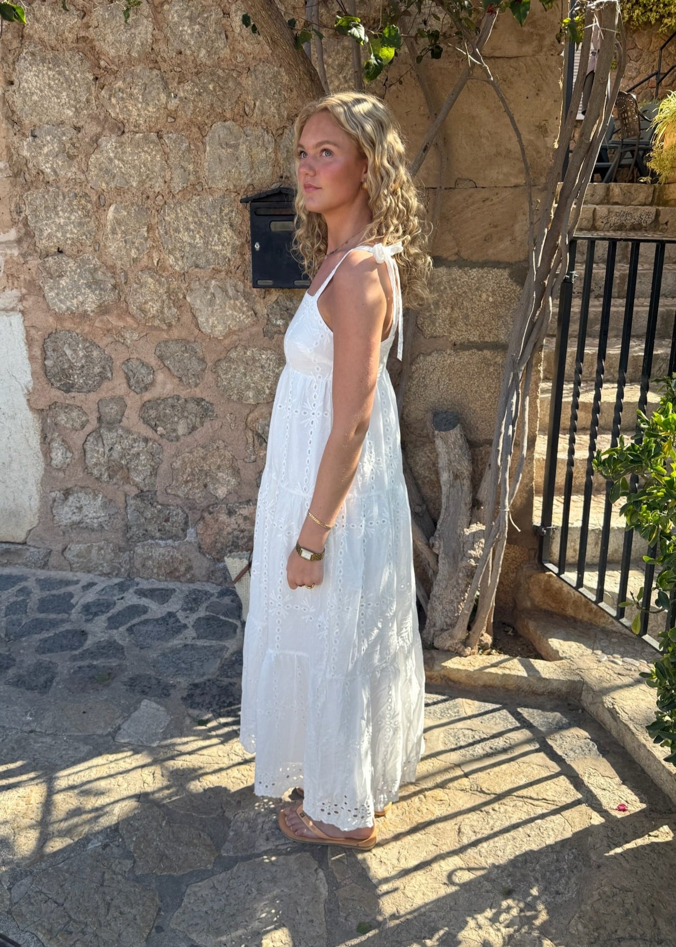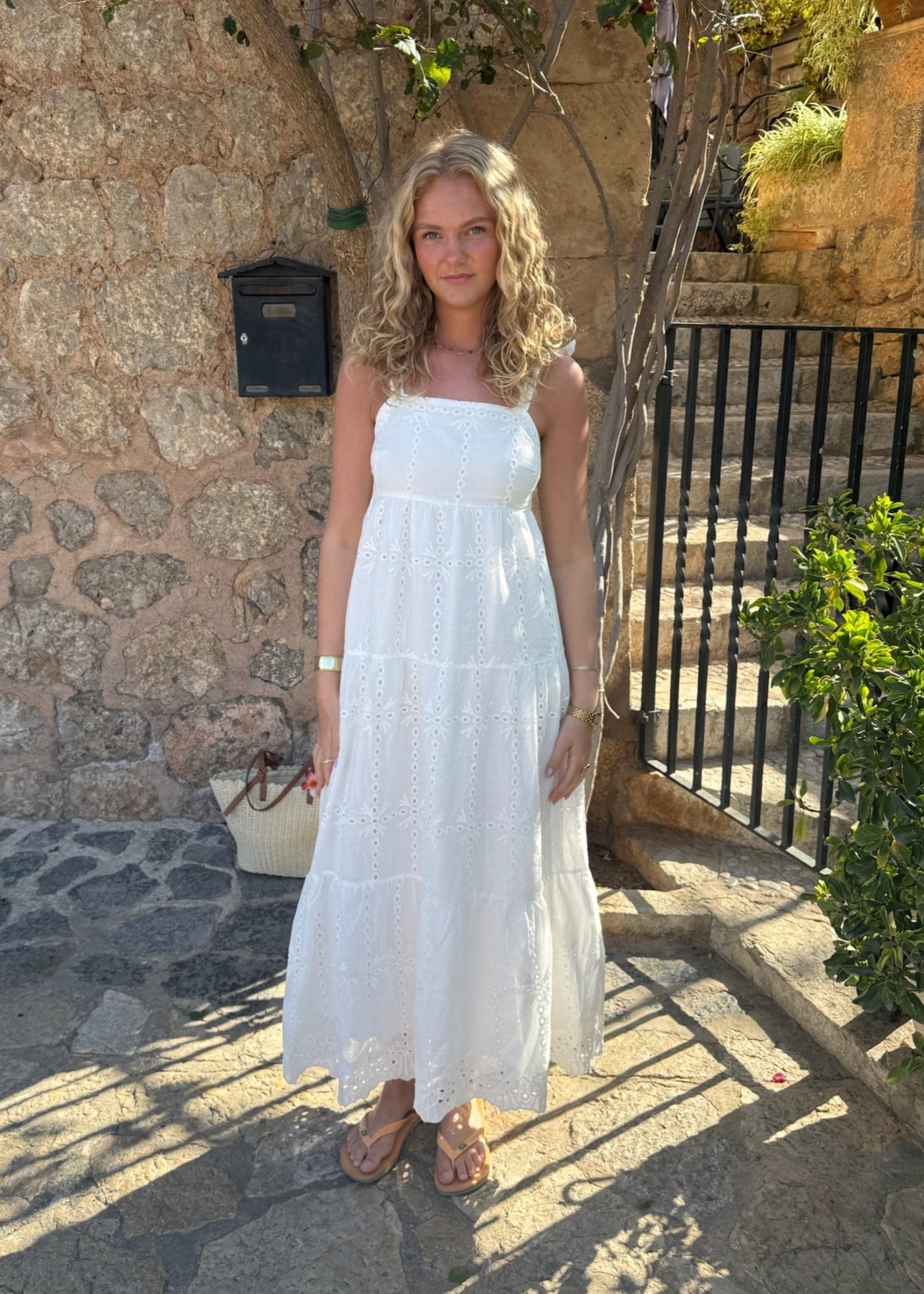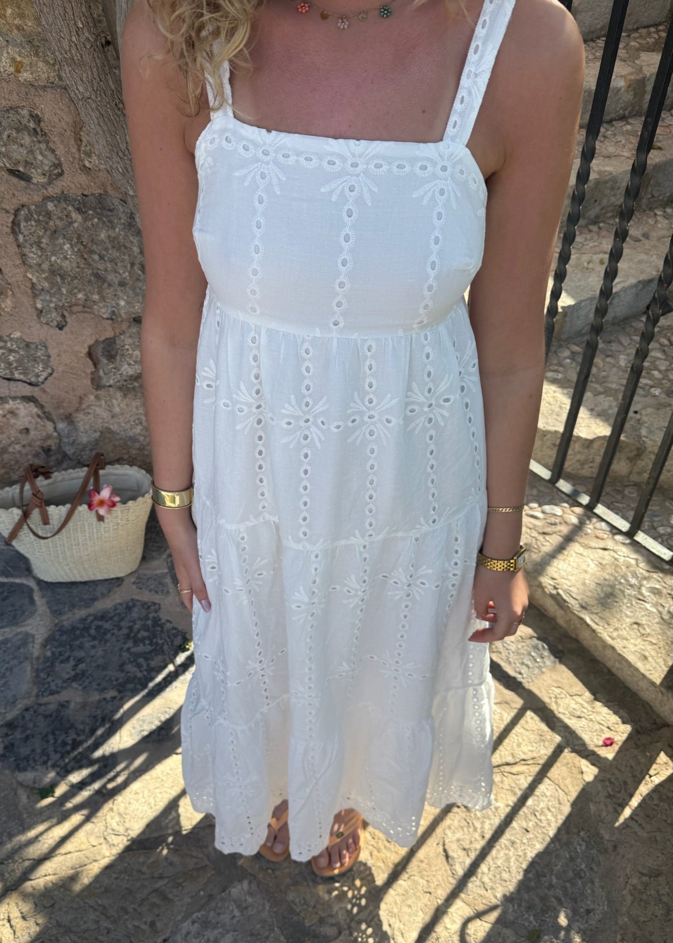 Vores Broderet Maxi Kjole er den smukkeste forårs- og sommerkjole – perfekt til studentertiden! Den har en firkantet udskæring både foran og bagpå samt brede stropper, der kan bindes ved skulderen. Kjolen er lavet i 100% broderet bomuld🌸