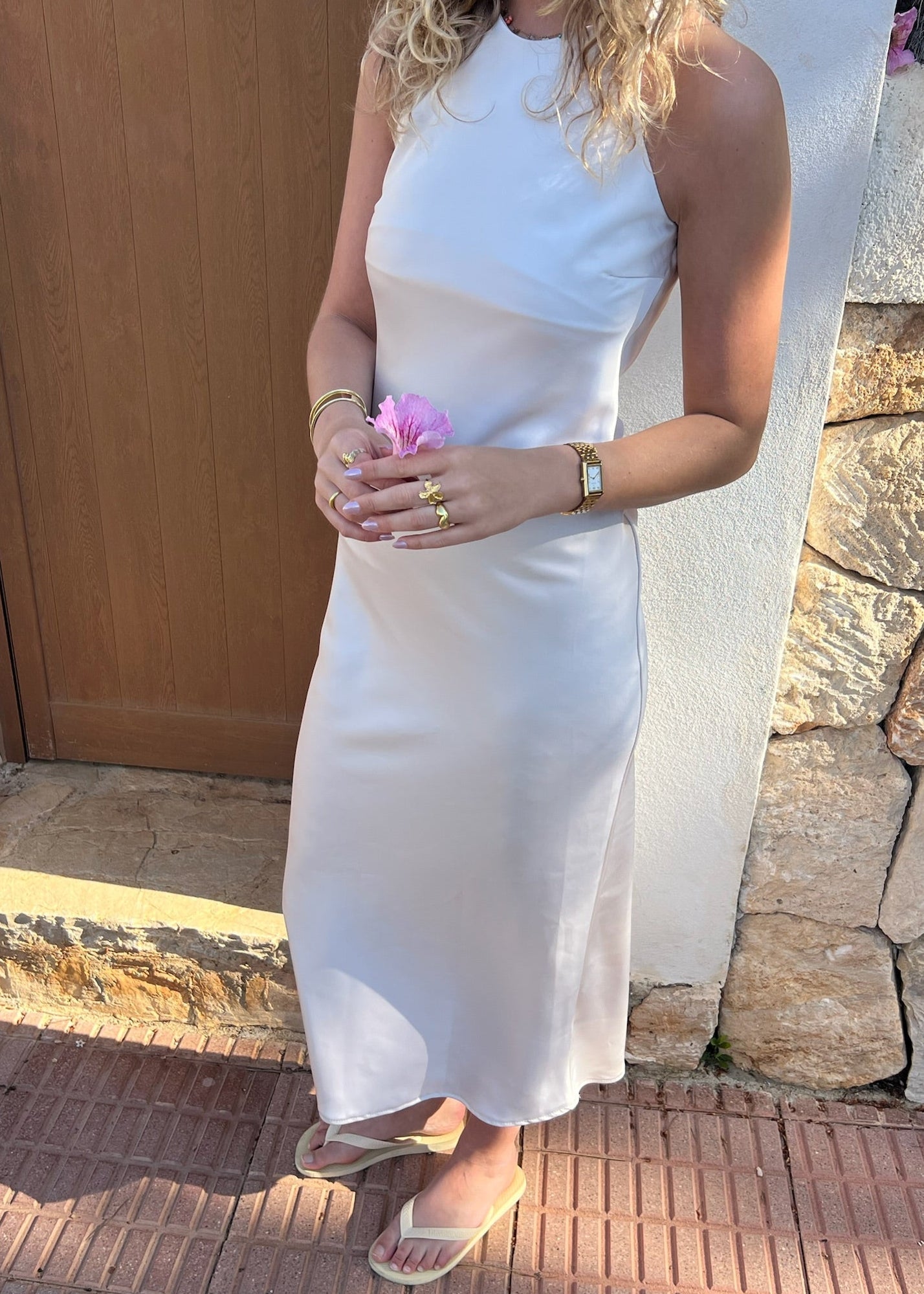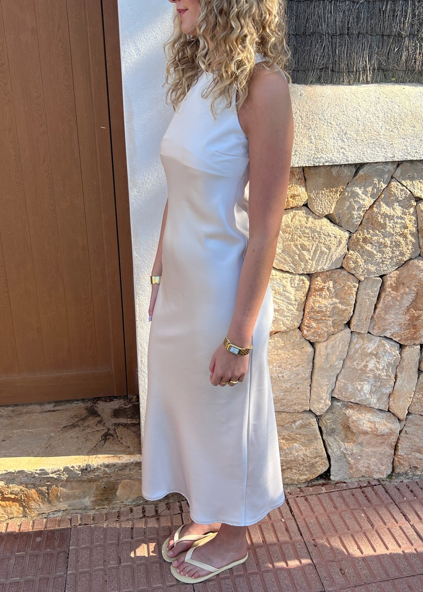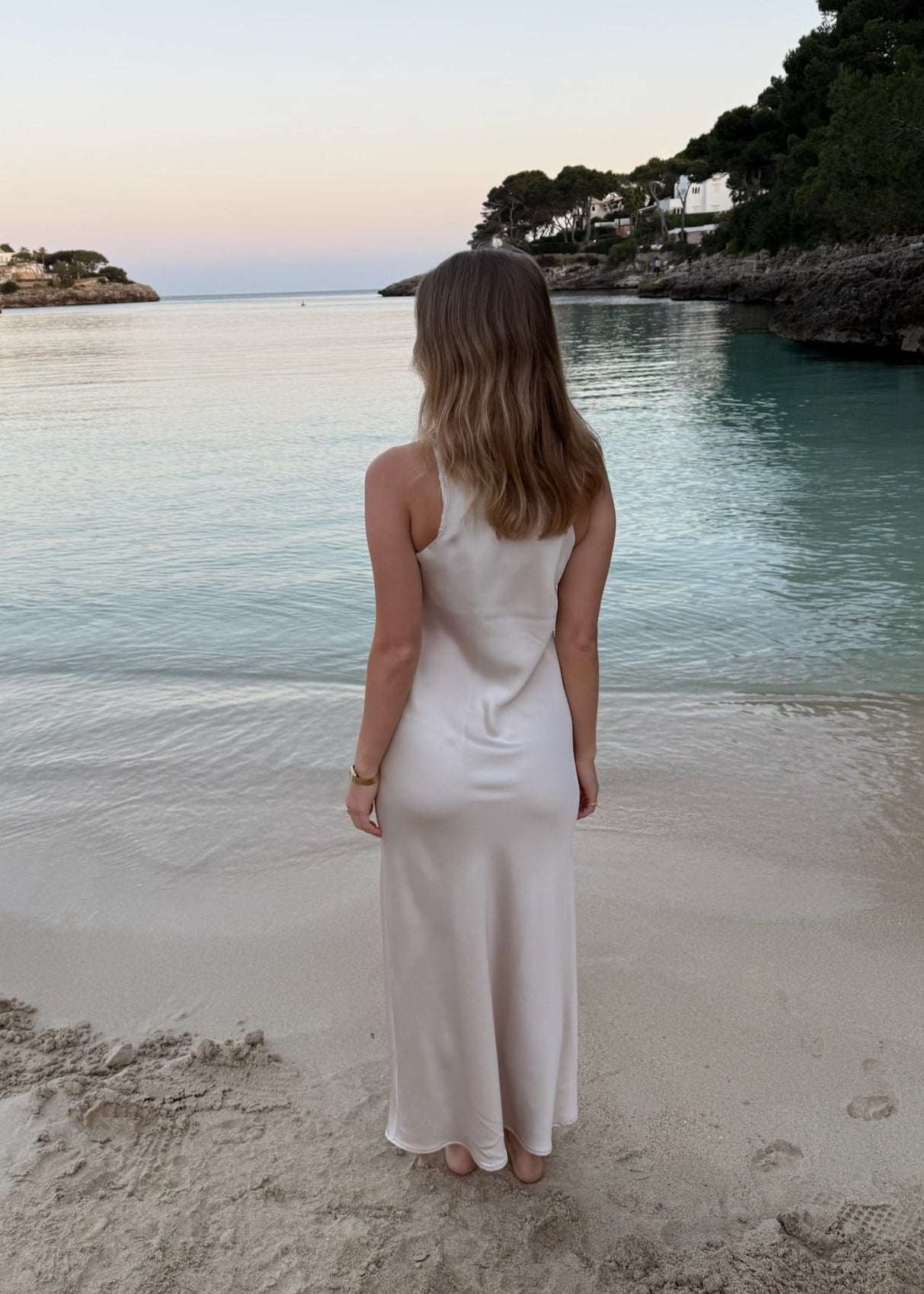 Vores Cleo-serie er fremstillet i det fineste satinlignende materiale, der giver et elegant udtryk. Kjolen har en smuk, flowy pasform, der falder pænt. Den er uden ærmer, hvilket gør den perfekt til varmere dage, og den lukkes diskret med en lille knap i nakken, der tilføjer en fin detalje✨