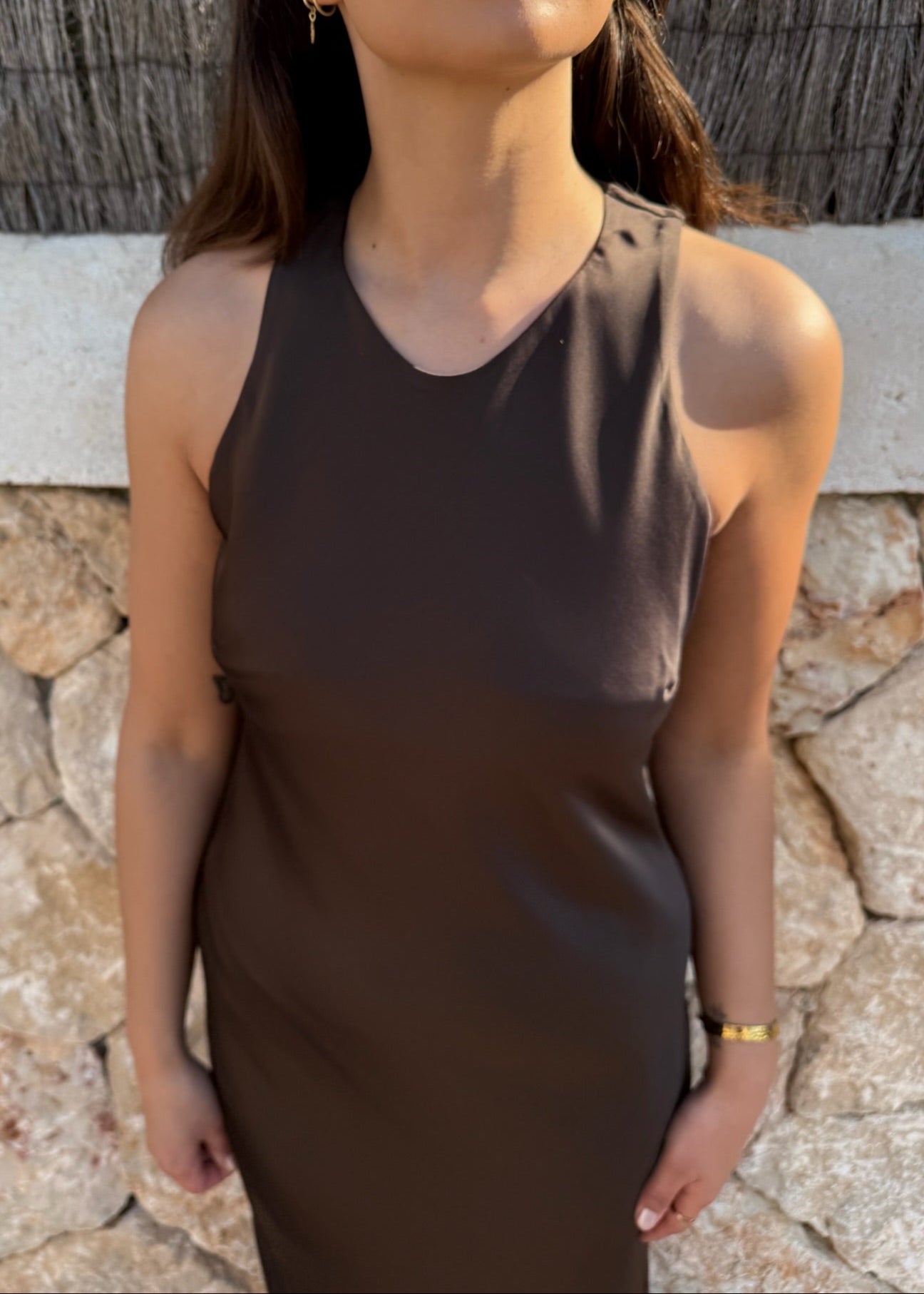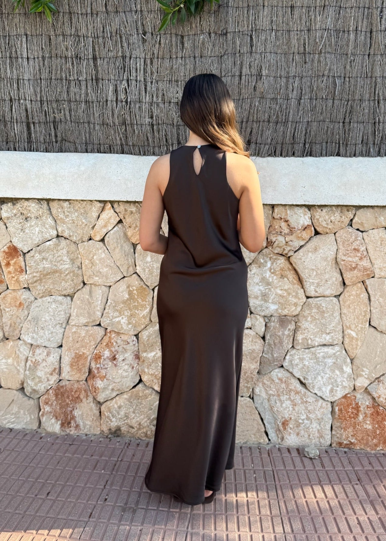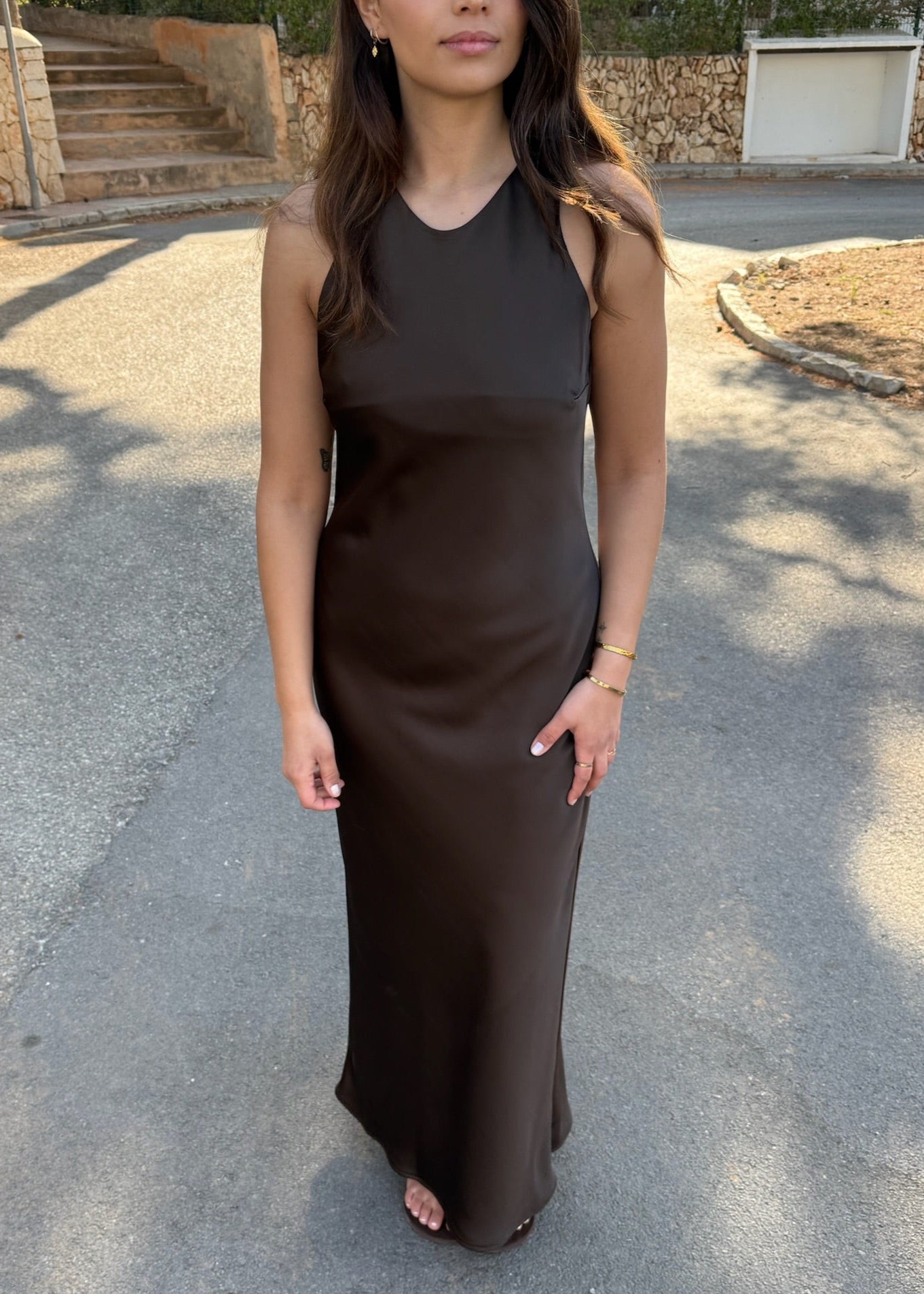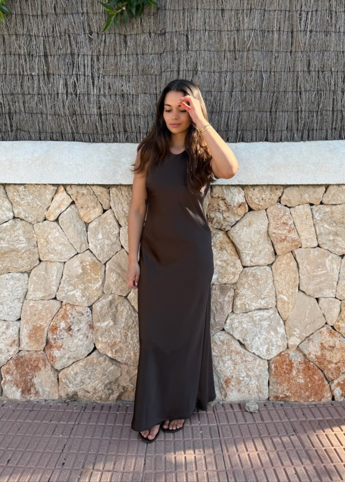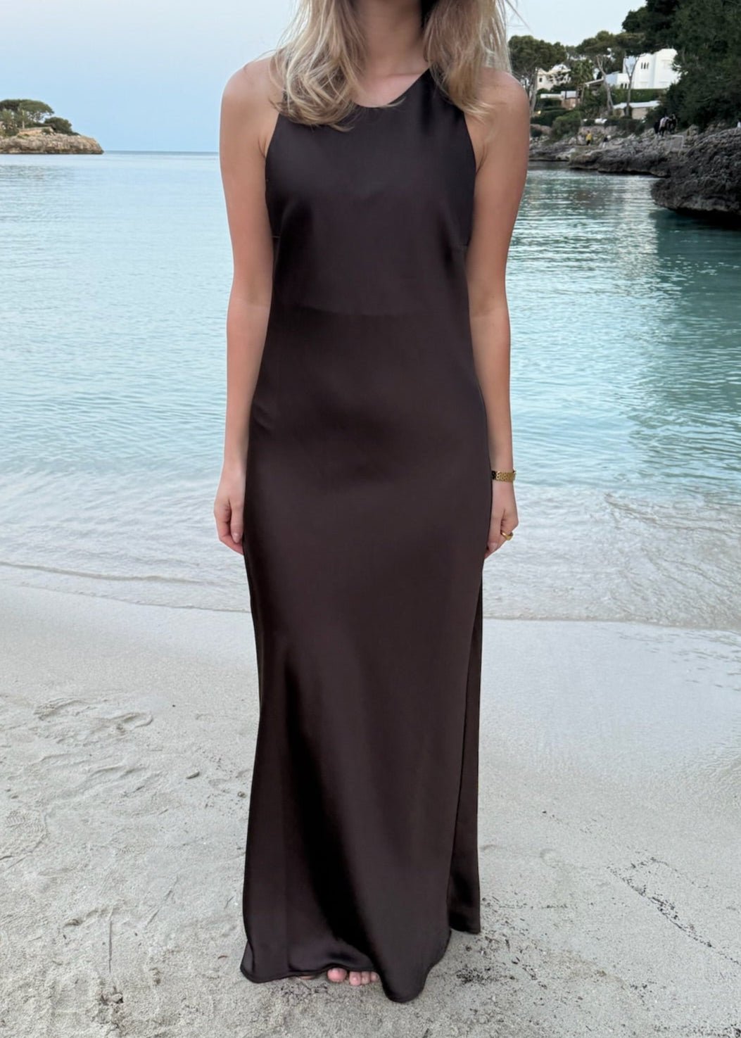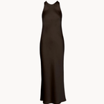 Vores Cleo-serie er fremstillet i det fineste satinlignende materiale, der giver et elegant udtryk. Kjolen har en smuk, flowy pasform, der falder pænt. Den er uden ærmer, hvilket gør den perfekt til varmere dage, og den lukkes diskret med en lille knap i nakken, der tilføjer en fin detalje✨