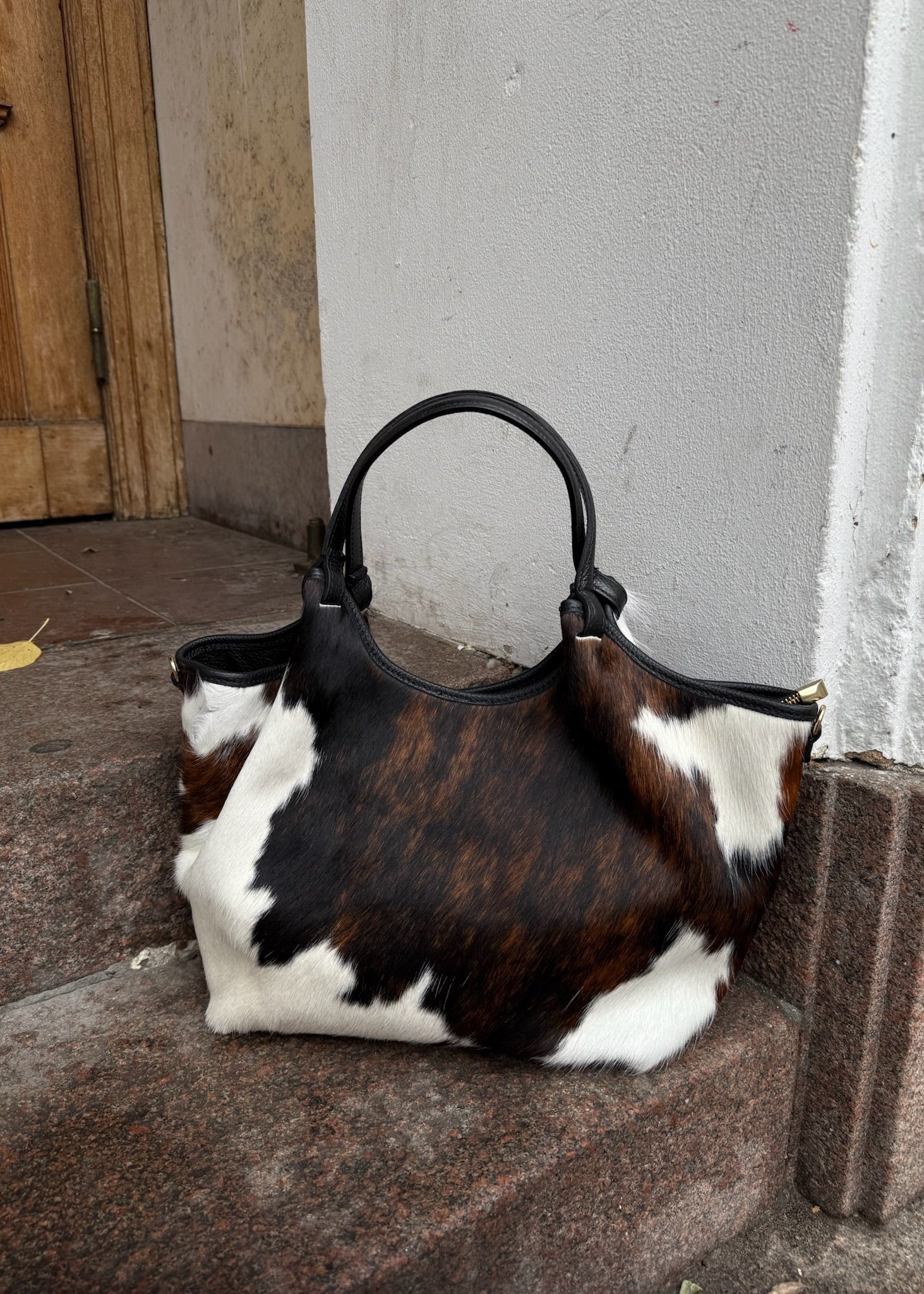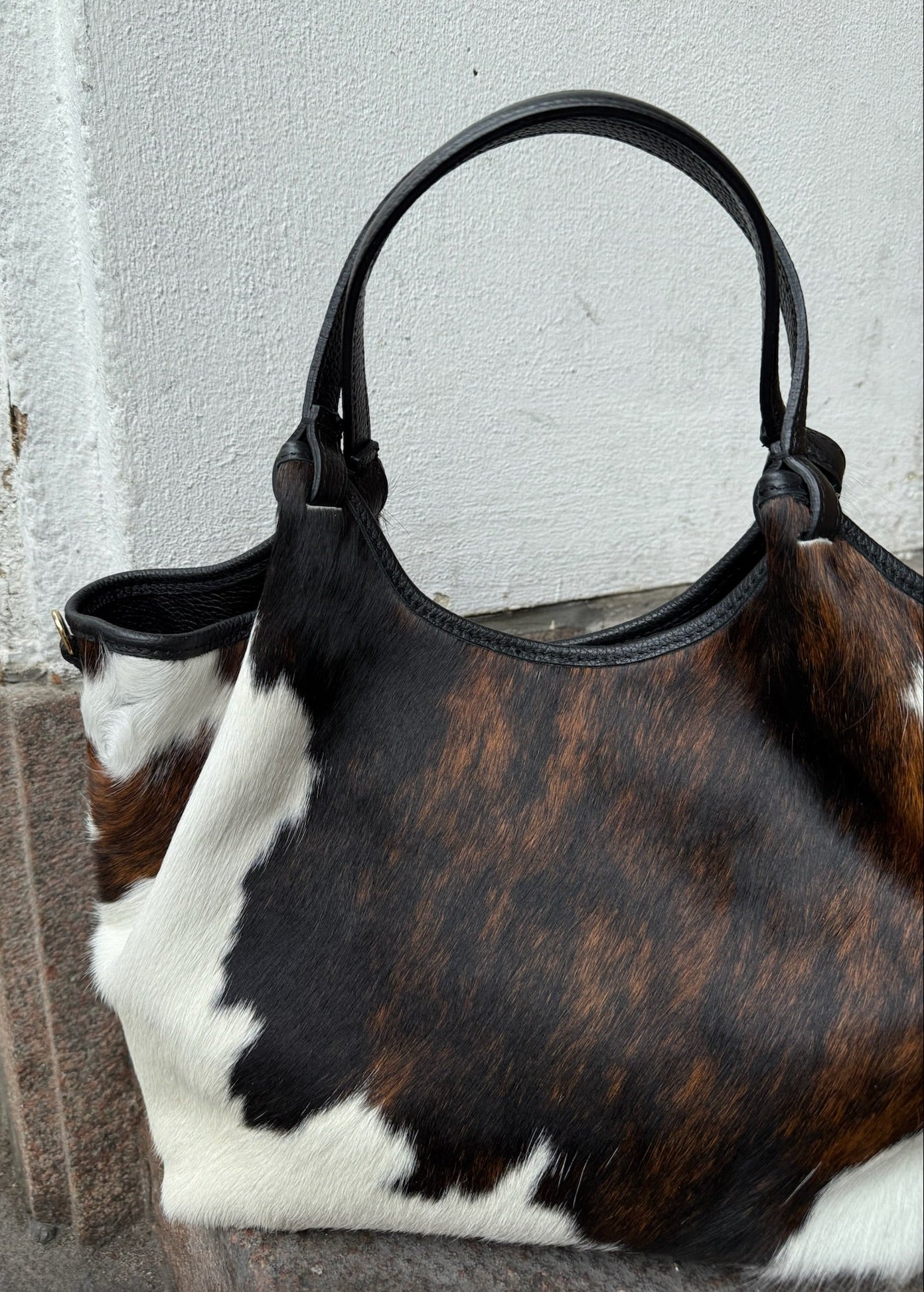 Cow Tasken er en stilfuld og trendy skuldertaske lavet i ægte læder og med koskind. Tasken har plads til en 13-tommer computer. Tasken har et stort rummeligt rum med håndtag, som bæres på skuldrene🤎