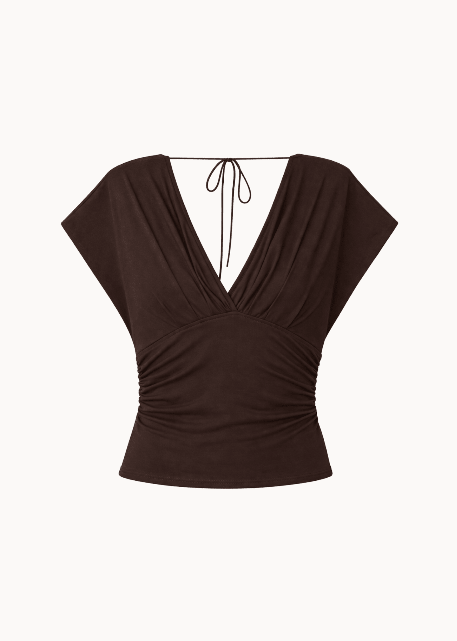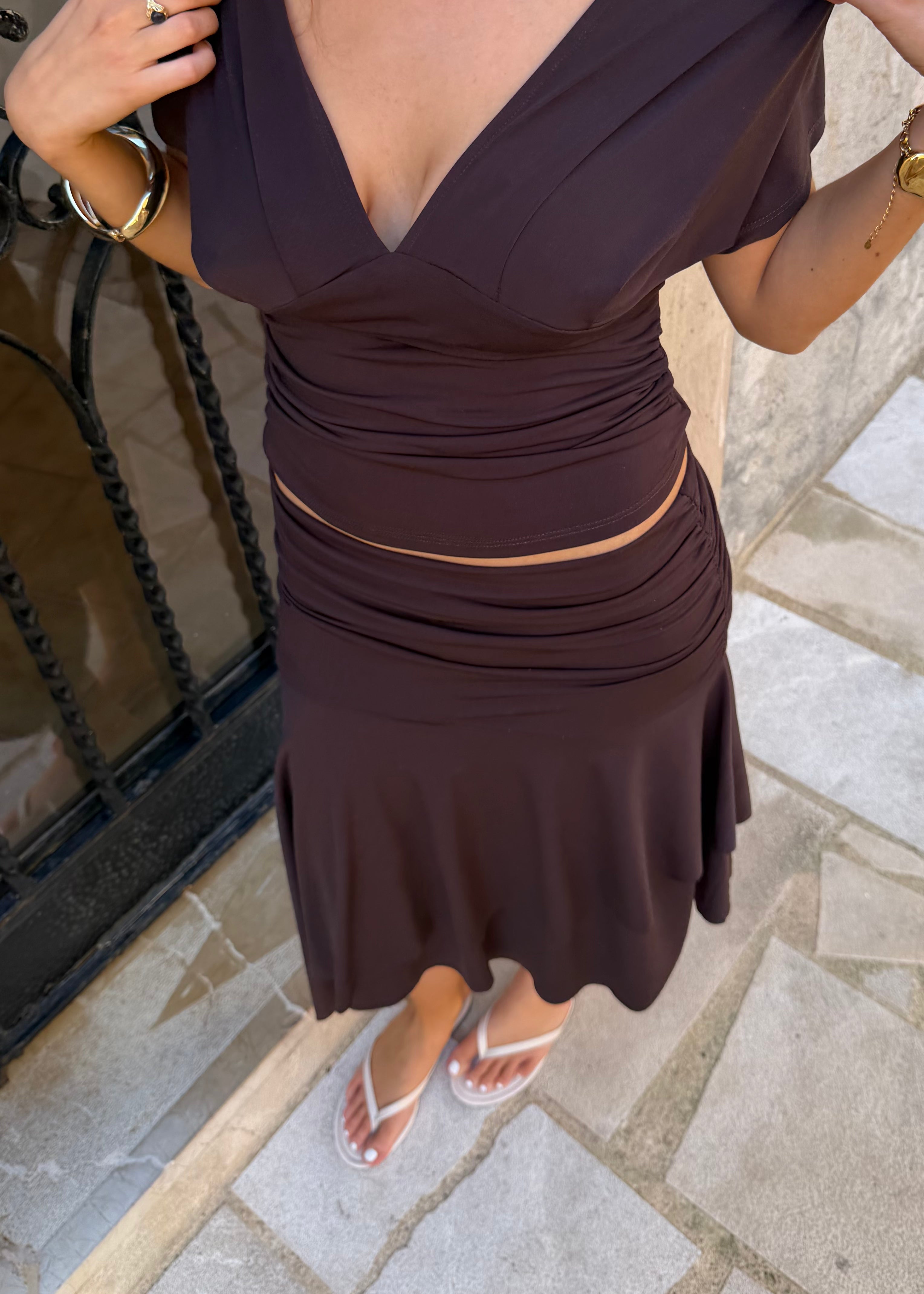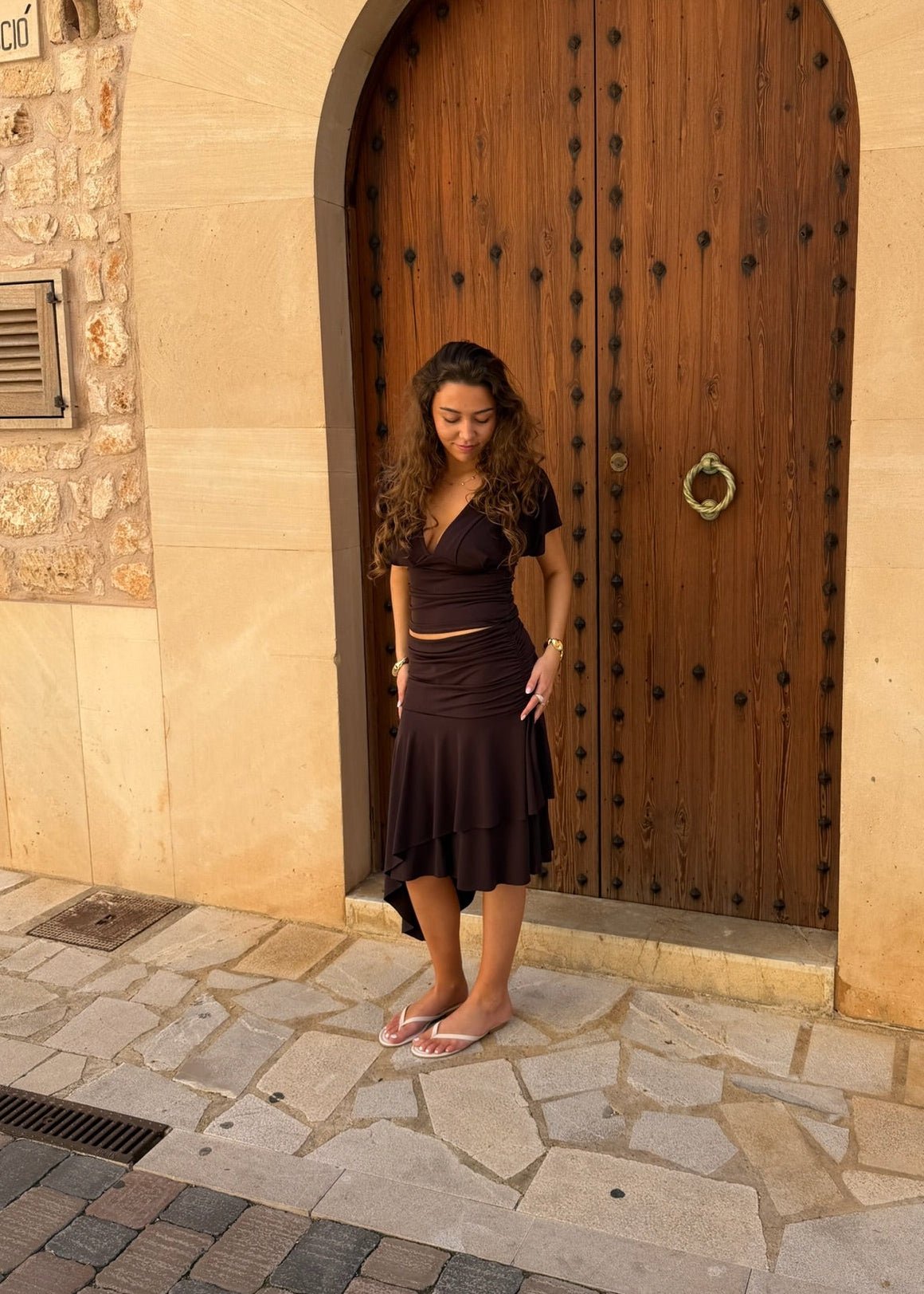 Vores Aia Asymmetriske Midi Nederdel og Gaia Top er skabt til hinanden og giver et let, feminint og stilrent udtryk. Nederdelen har en smuk asymmetrisk form og midi-længde, der falder elegant, mens det brede bånd fremhæver silhuetten. Toppen fuldender looket med sine flowy korte ærmer, dybe V-udskæring og åbne ryg, som giver et feminint og luftigt touch.