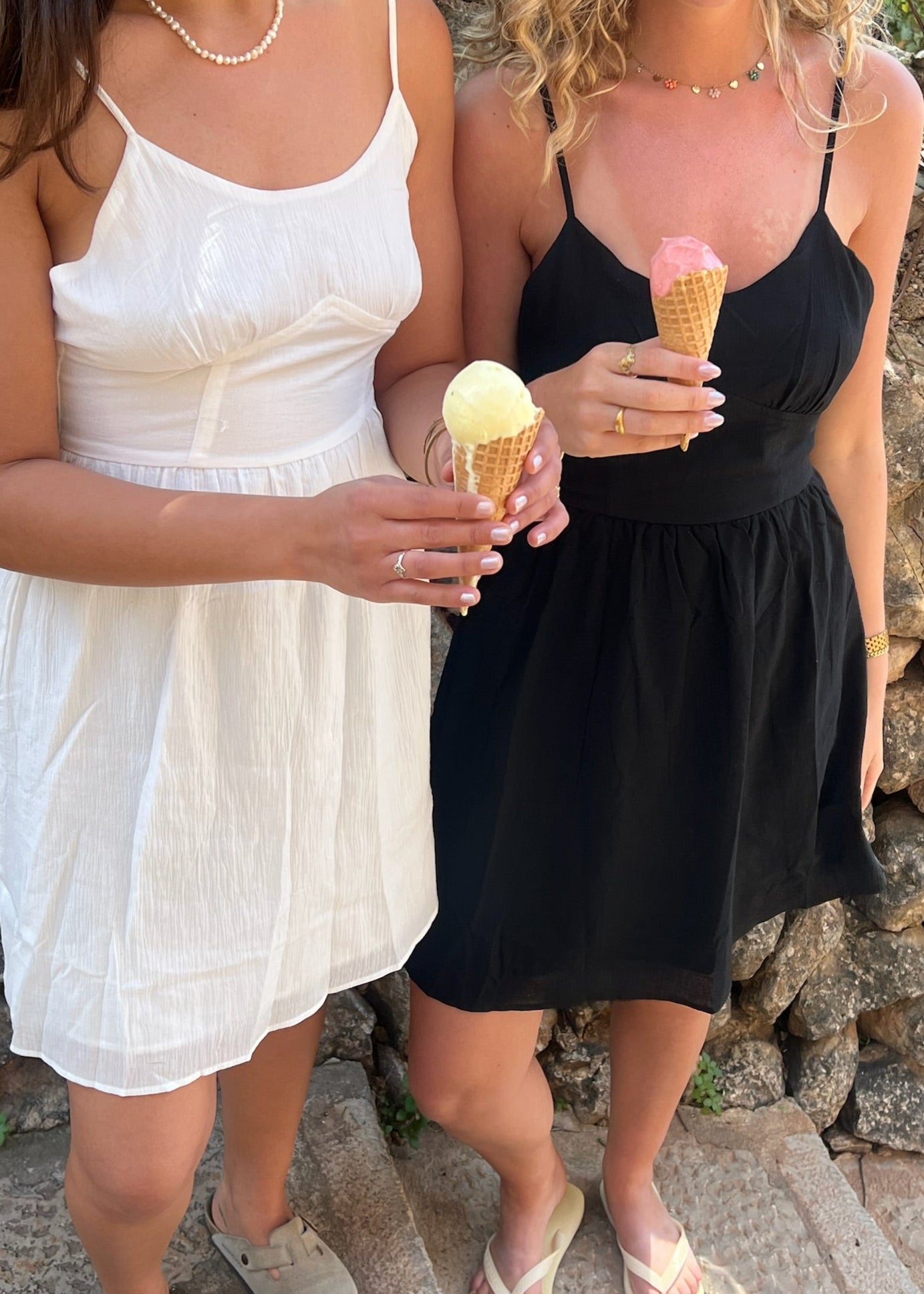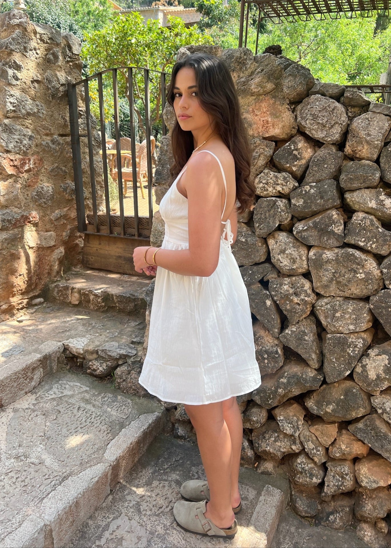 Vores Mini Kjole med Bindebånd er en let og luftig sommerkjole🌼 Den har tynde spaghetti-stropper og en åben ryg, hvor et tyndt bindebånd tilføjer en sød detalje!