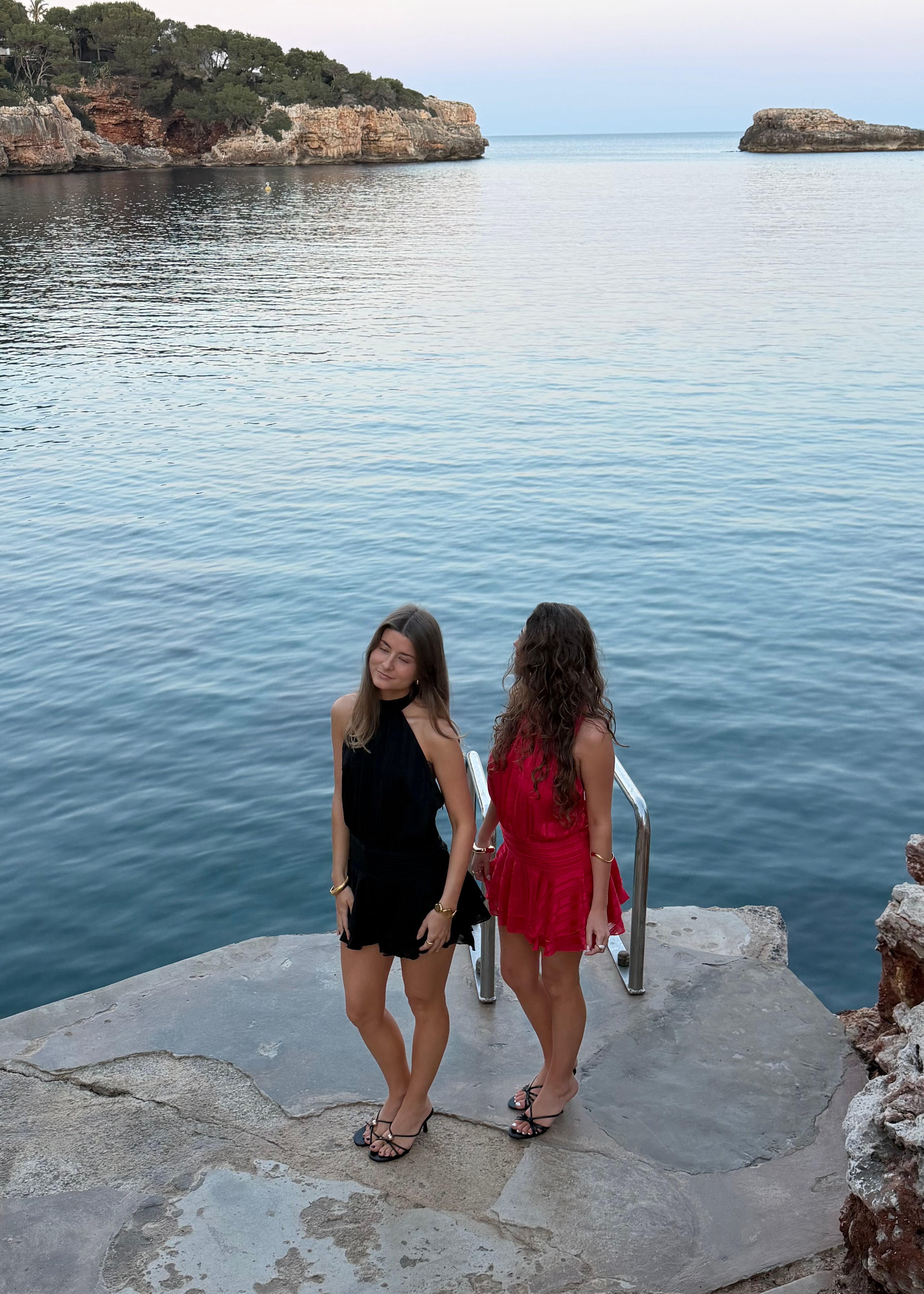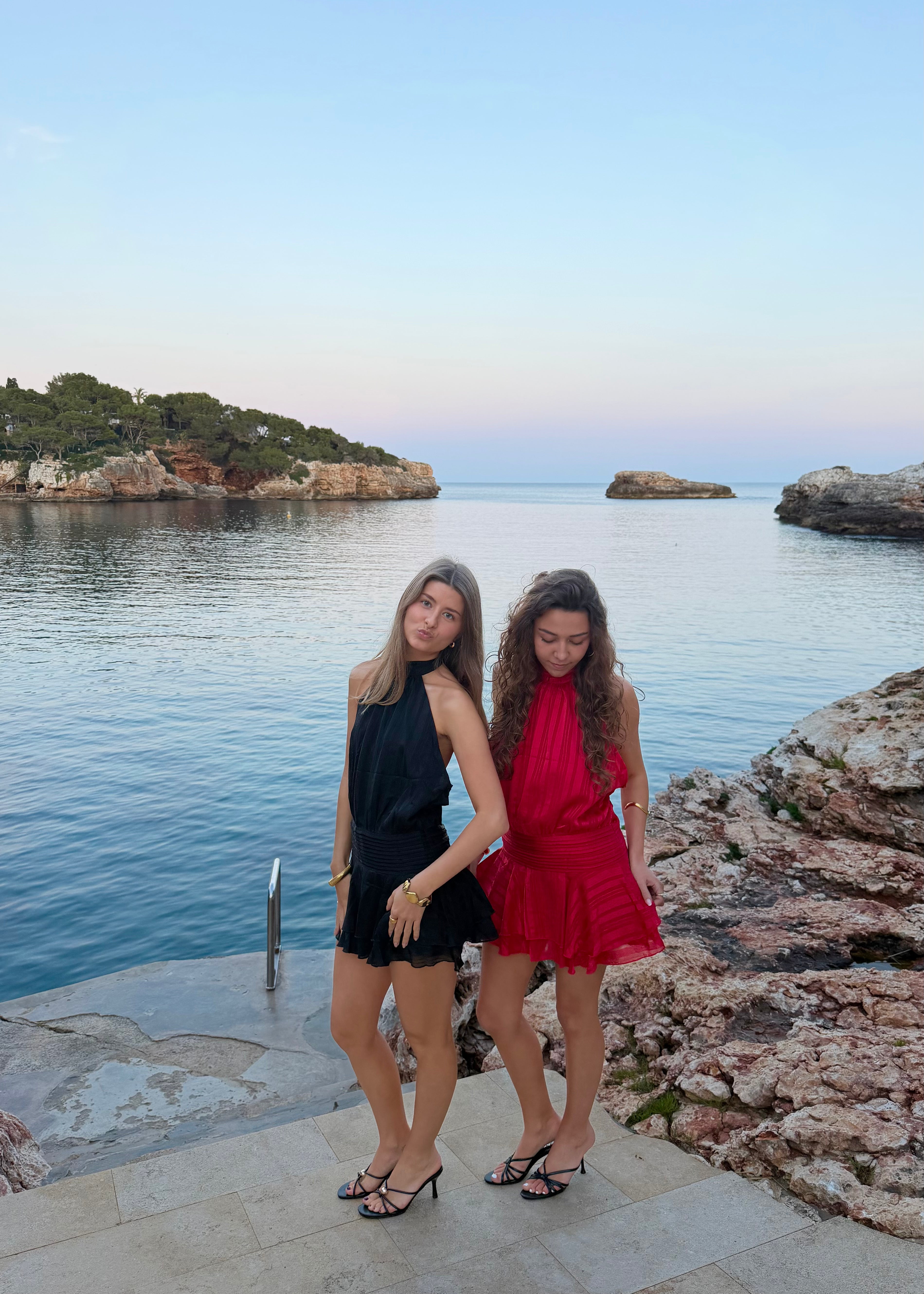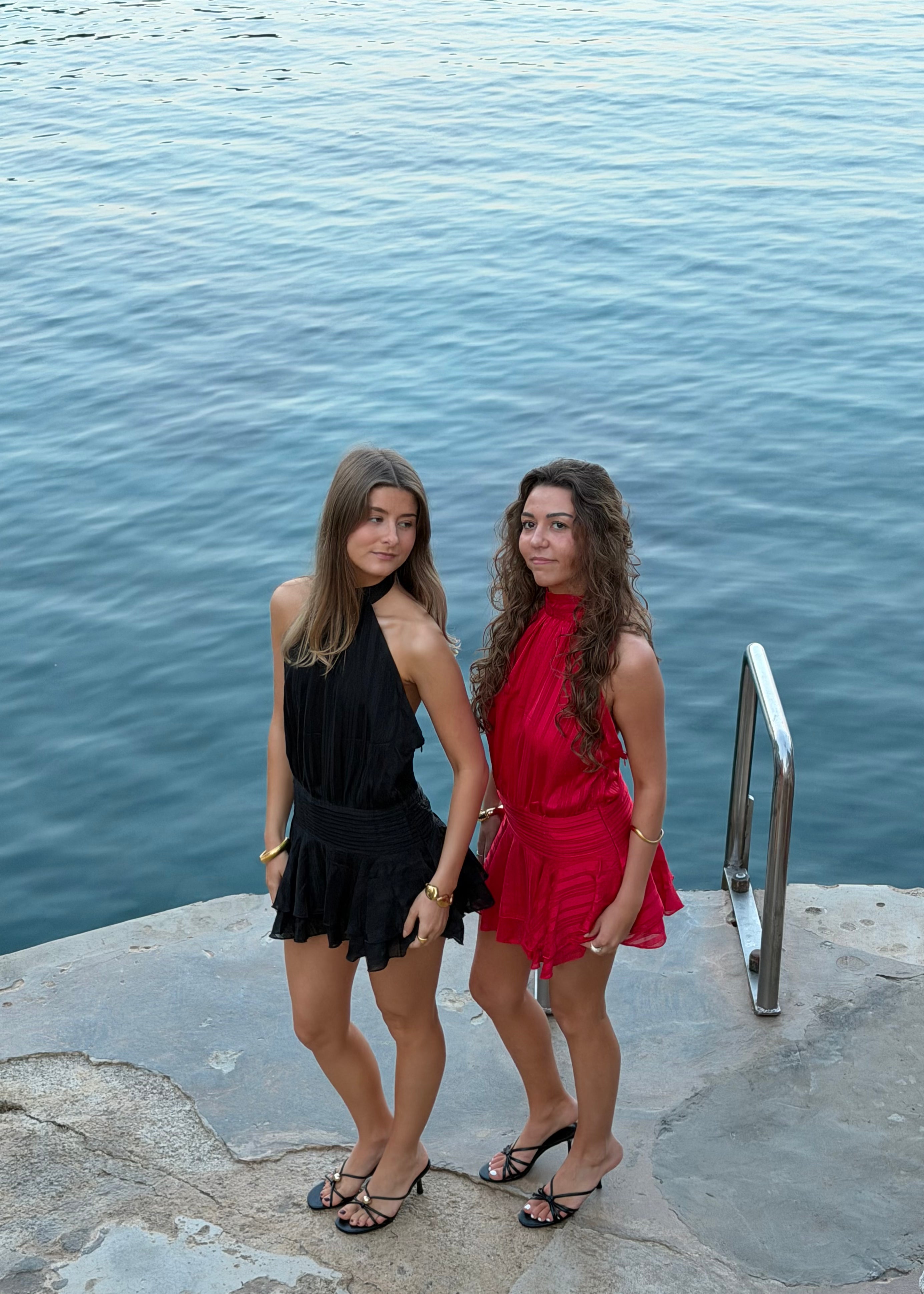 Nora Flair Mini Kjole er en elegant og feminin kjole designet i en smuk satin-look kvalitet med diskret stribet struktur. Den har halterneck-lukning, en løs og draperet overdel samt en markeret talje, der skaber en smigrende silhuet. Nederdelen består af to lag, som giver et let og festligt fald og skaber smuk bevægelse✨