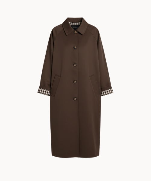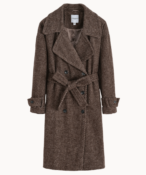Vores nye Ruskind lang Coat er en tidløs frakke i ruskindslignende materiale i en smuk brun farve. Med dobbeltradet knaplukning, bælte i taljen og klassiske trench-detaljer kombinerer den elegance og funktionalitet. Perfekt til efterår og vinter, når du vil have et stilrent men varmt look🍂🤎