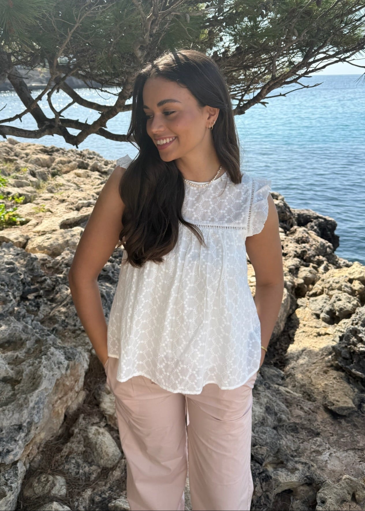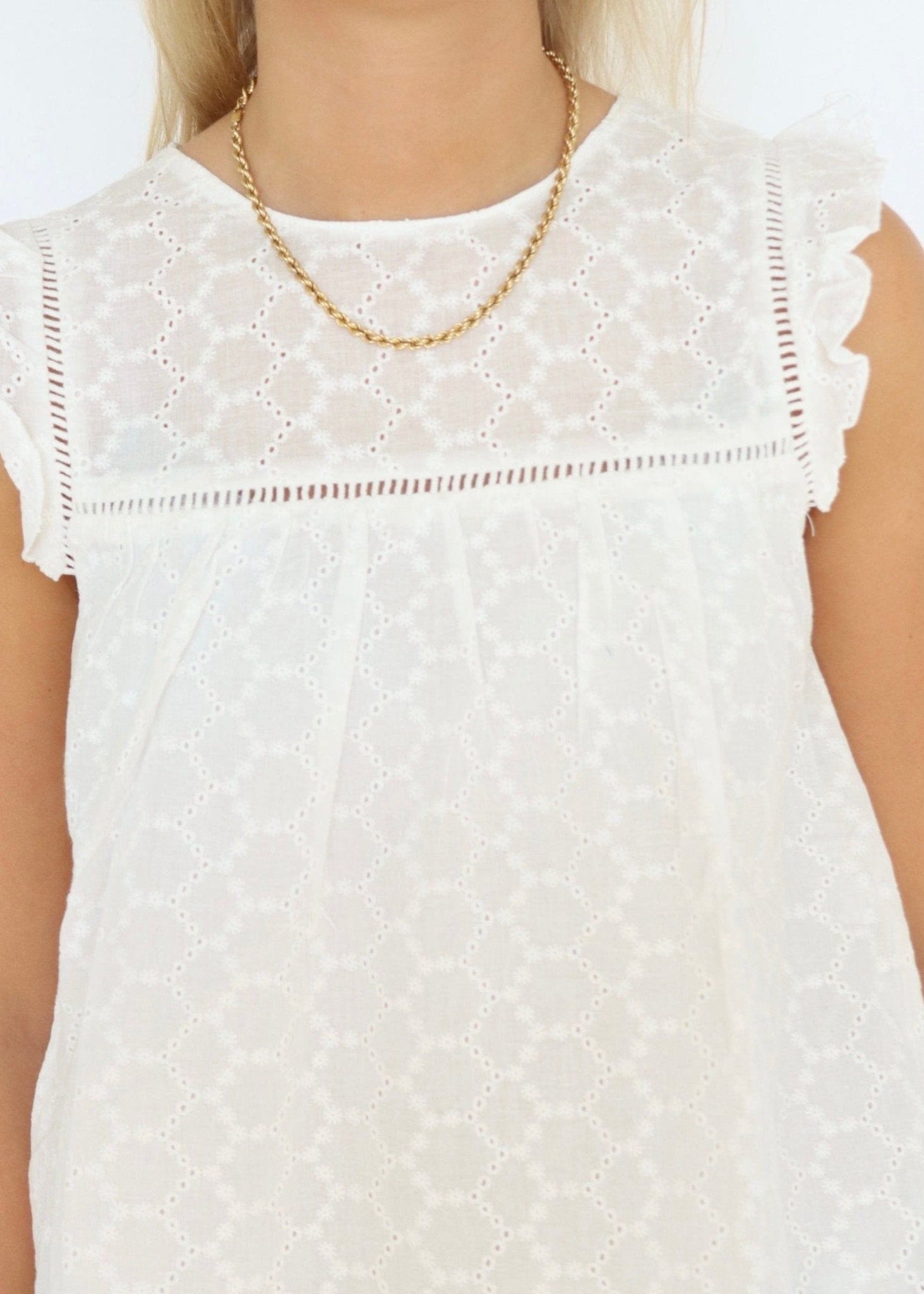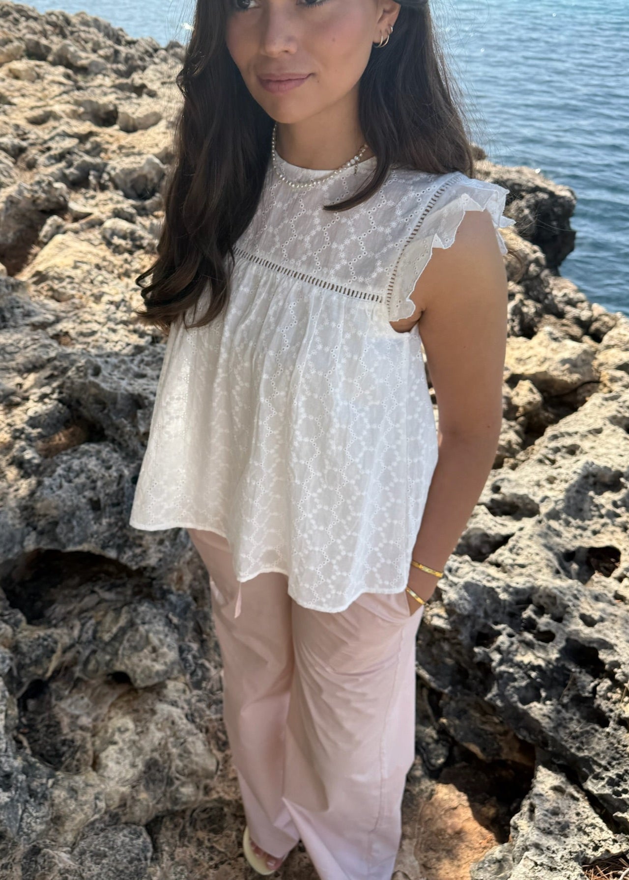 Vores fine hvide Signe Top er den perfekte top til sommeren. Den er let og yndig og har desuden en masse fine og elegante detaljer. Toppen har en høj halsudskæring samt fine detaljer ved ærmerne☀️🌸