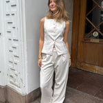 Vores smukke Sira sæt fås med Habitbukser og matchende vest. Bukserne har lange ben og et løst, lige fit. De har lommer og lukkes med knap og lynlås foran. Habitvesten har en bred, rund halsudskæring, klassisk knaplukning foran og to fine snydelommer🌟