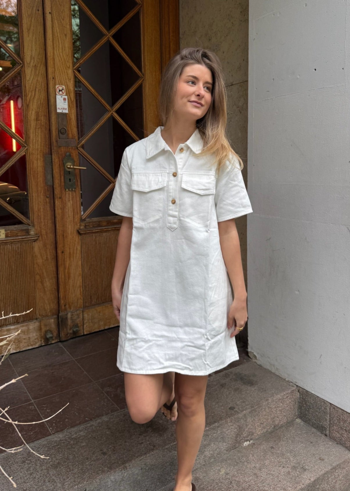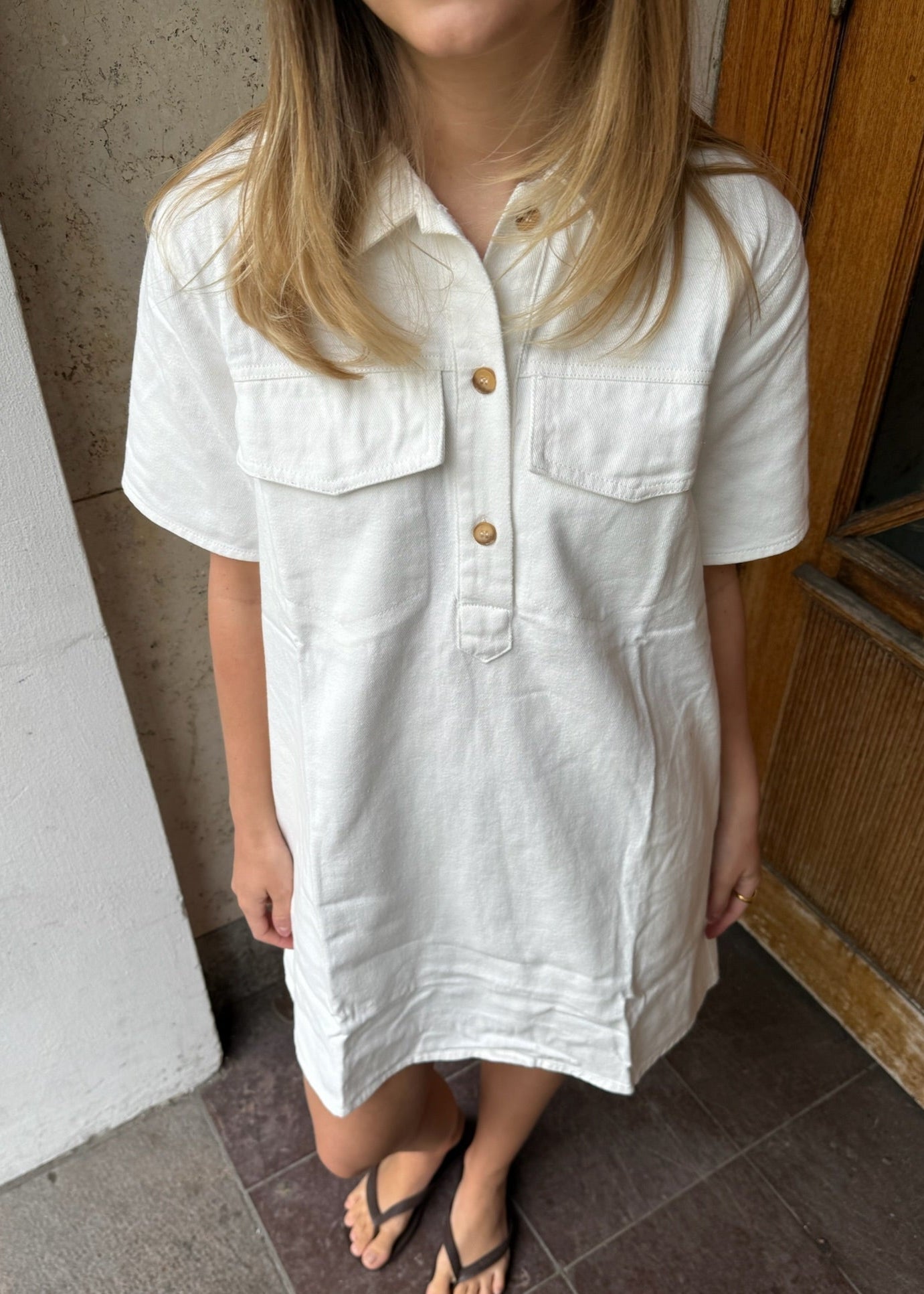 Vores fine nye Sophie Denimkjole er en fin og let kjole, som går til over knæet med korte ærmer. Kjolen har to lommer foran ved brystet. Derudover har den en løstsiddende pasform med knappelukning foran samt en klassisk skjortekrave💙
