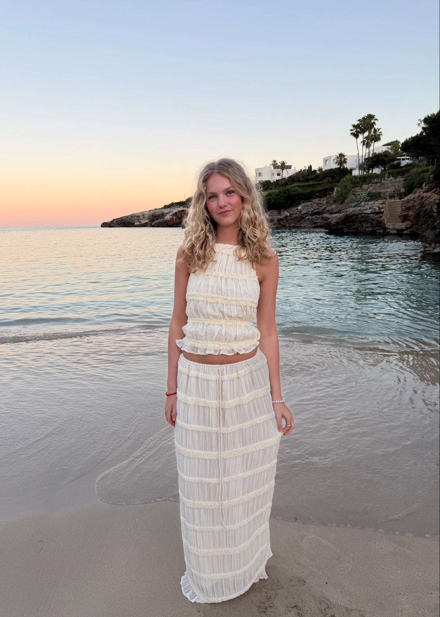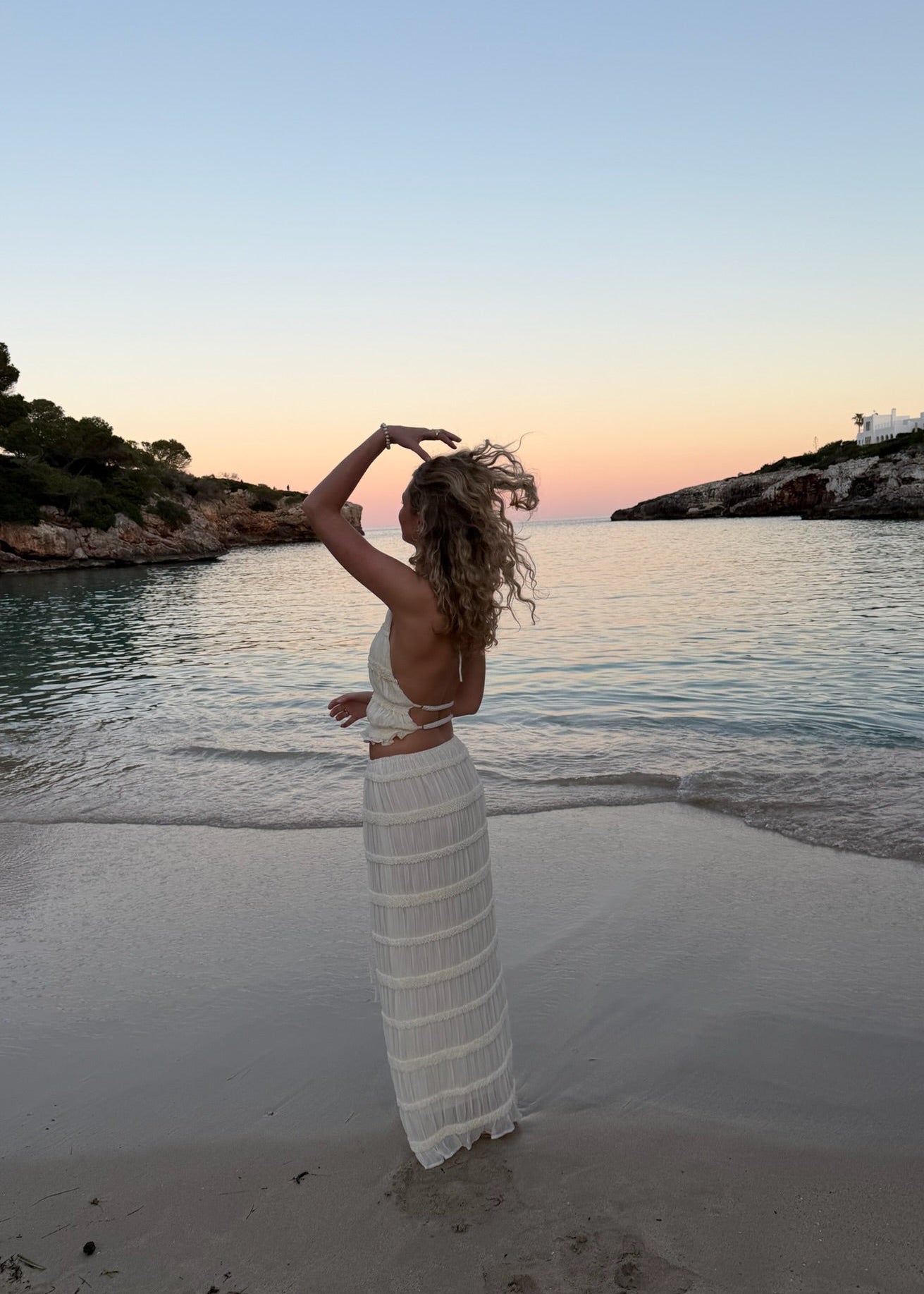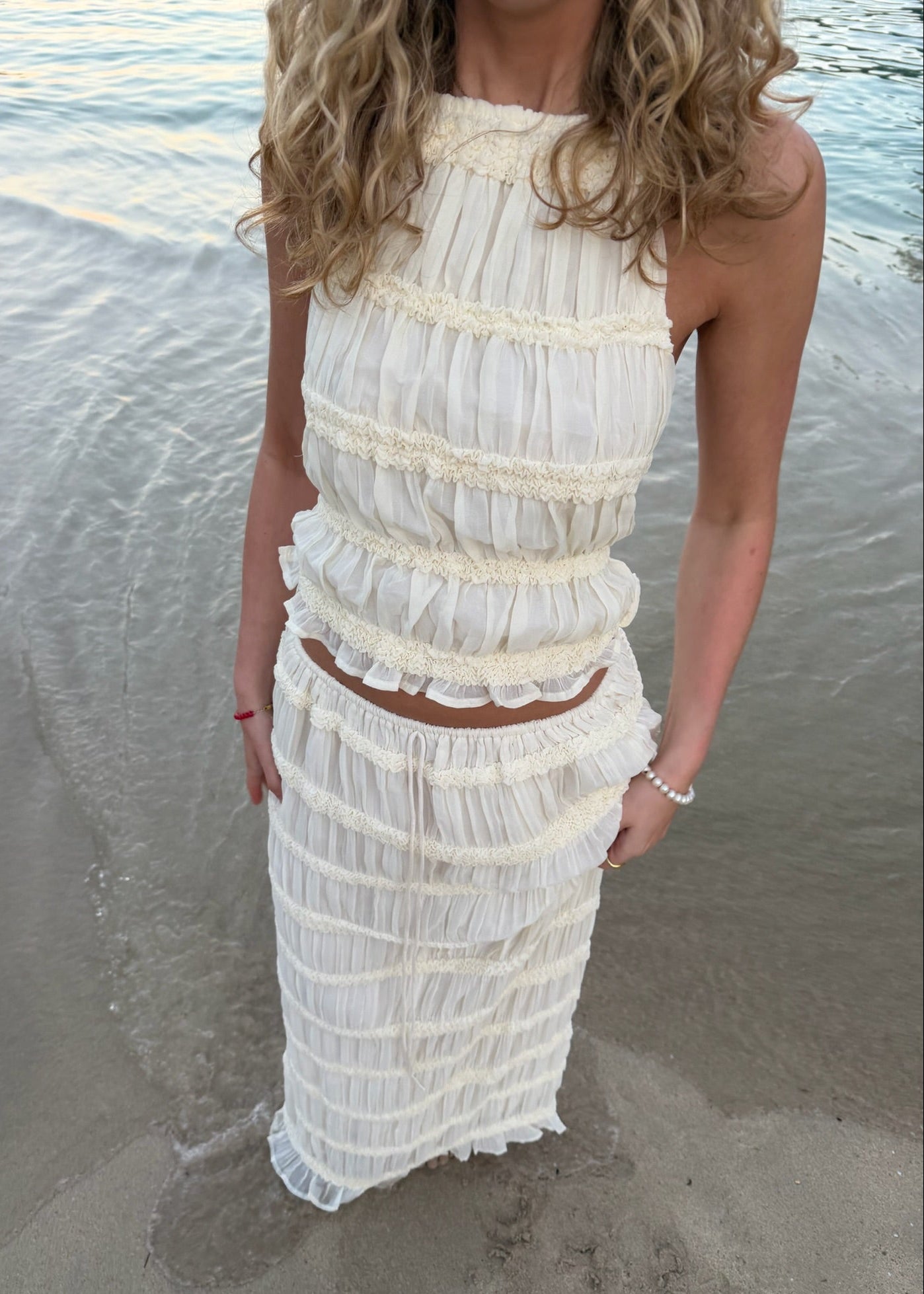 Vores Valeria Mesh Top har bar ryg og bindedetalje, som giver et elegant og luftigt udtryk, mens nederdelen falder flot og let med sin transparente mesh-kvalitet.🤍