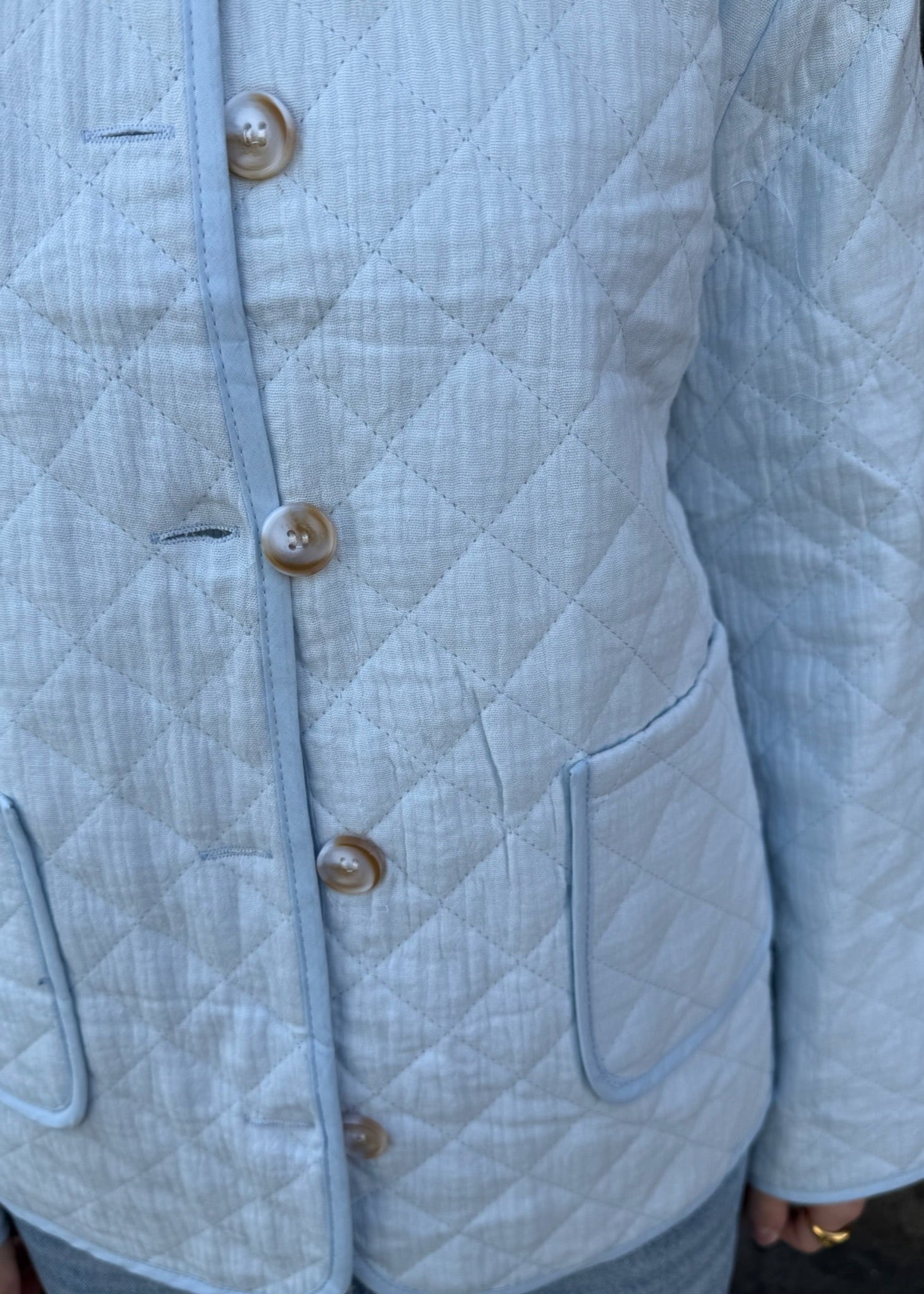 Vores Vatteret Jakke er den perfekte overgangsjakke til sæsonernes skift. Den er designet i et elegant quiltet mønster. Jakken har et klassisk snit med knaplukning foran og to praktiske frontlommer, som giver både funktionalitet og et afslappet udtryk🩷